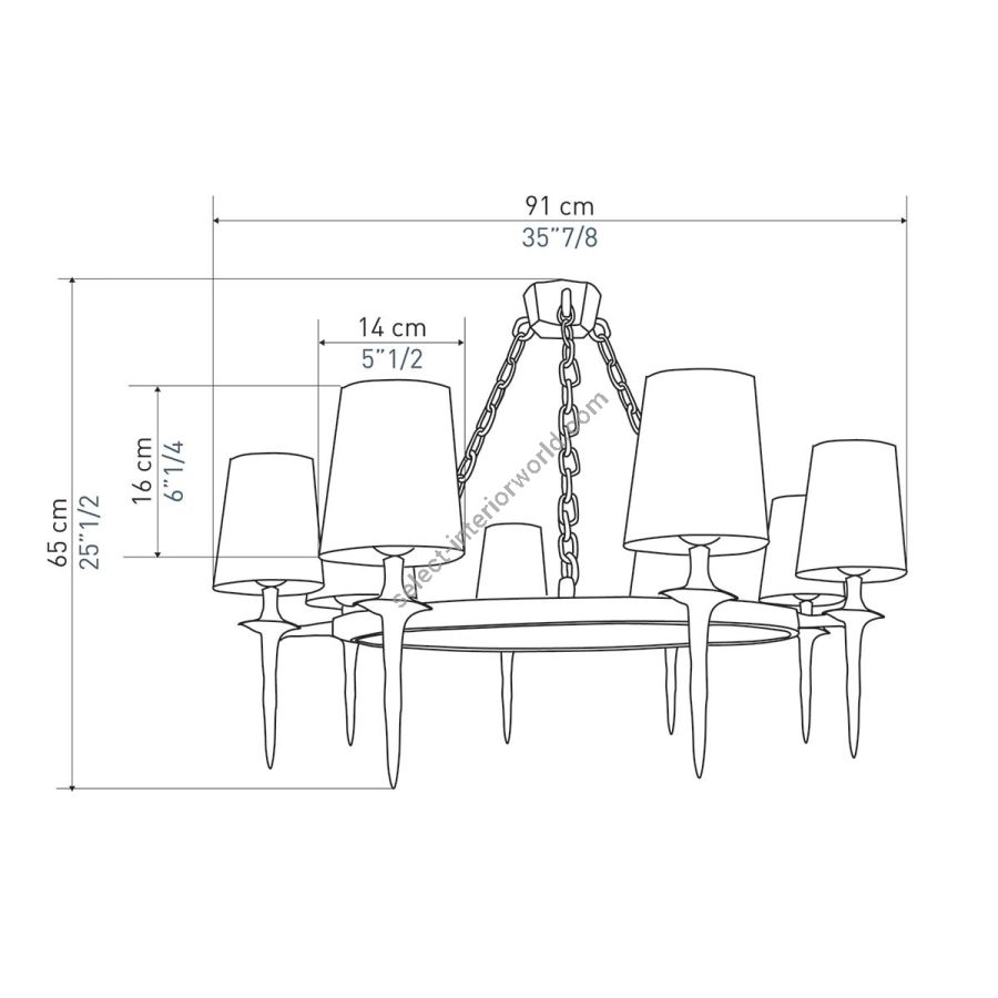 Width: 91 cm, Maximum: 8 x 40 w, Les Abat-jours peuvent être fabriqués dans 18 coloris au choix, The colour for the shades can be chosen out to 18 different hues