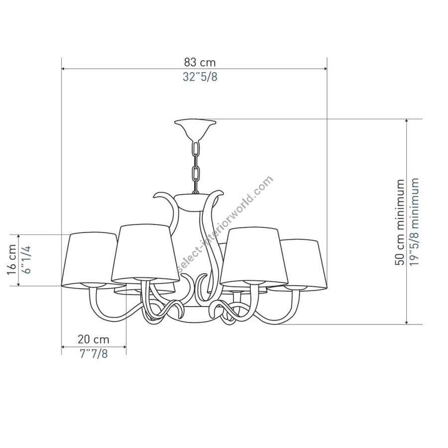 Width: 83 cm, Maximum: 6 x 100 w, Les Abat-jours peuvent être fabriqués dans 18 coloris au choix, The colour for the shades can be chosen out to 18 different hues