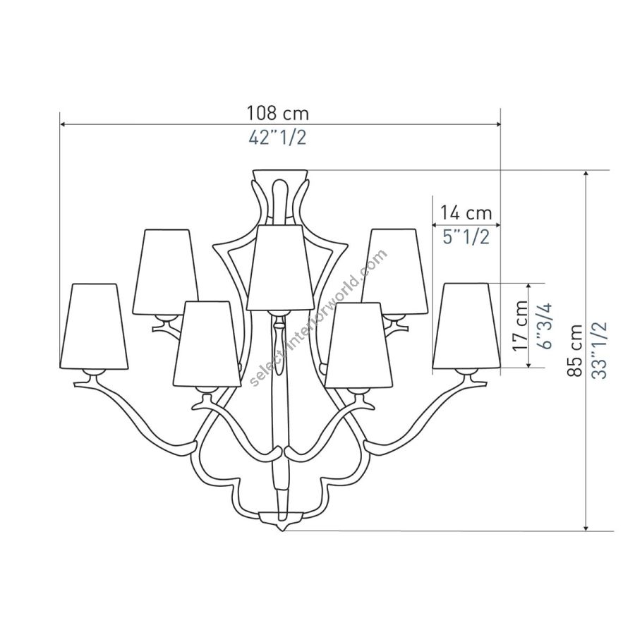 Width: 108 cm, Maximum: 15 x 40 w, Les Abat-jours peuvent être fabriqués dans 18 coloris au choix, The colour for the shades can be chosen out to 18 different hues