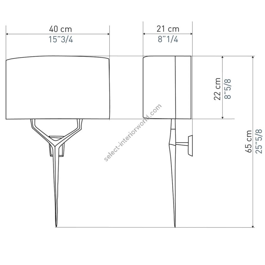Width: 40 cm, Projection: 21 cm, Maximum: 2 x 40 w, Les Abat-jours peuvent être fabriqués dans 18 coloris au choix, The colour for the shades can be chosen out to 18 different hues