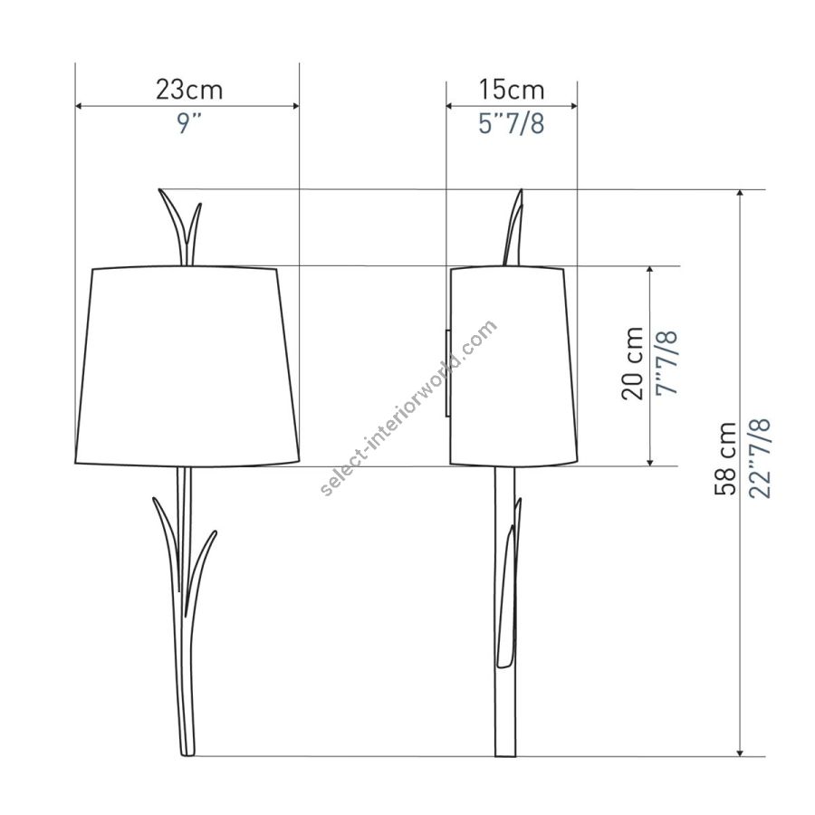 Width: 23 cm, Projection: 15 cm, Maximum: 2 x 40 w, Les Abat-jours peuvent être fabriqués dans 18 coloris au choix, The colour for the shades can be chosen out to 18 different hues