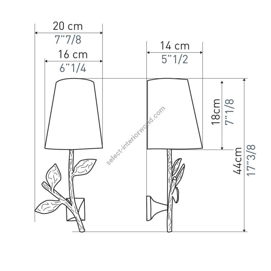 Width: 20 cm, Projection: 14 cm, Maximum: 40 w, Les Abat-jours peuvent être fabriqués dans 18 coloris au choix, The colour for the shades can be chosen out to 18 different hues