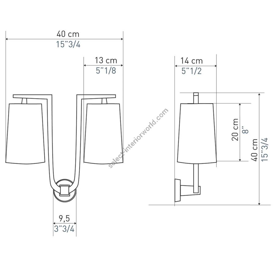 Width: 40 cm, Projection: 14 cm, Maximum: 2 x 40 w, Les Abat-jours peuvent être fabriqués dans 18 coloris au choix, The colour for the shades can be chosen out to 18 different hues