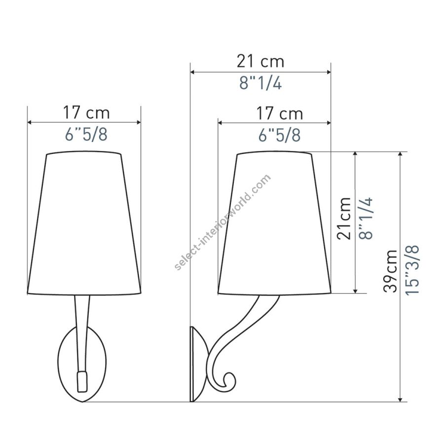 Width: 17 cm, Projection: 21 cm, Maximum: 100 w, Les Abat-jours peuvent être fabriqués dans 18 coloris au choix, The colour for the shades can be chosen out to 18 different hues