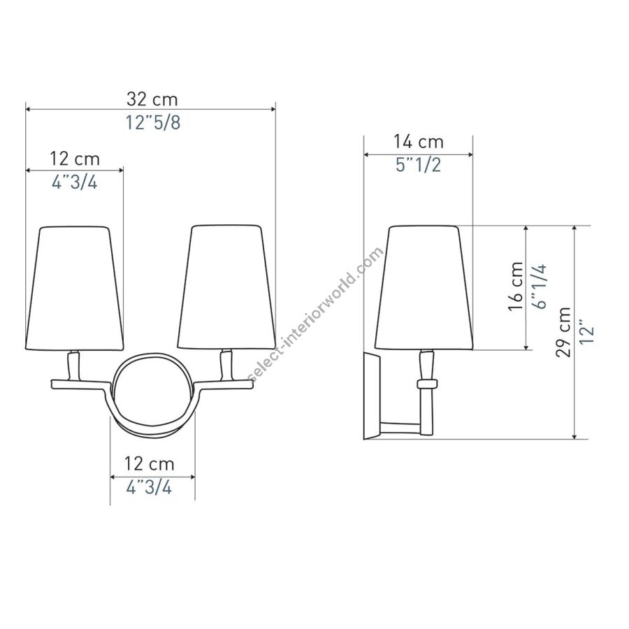 Width: 32 cm, Projection: 14 cm, Maximum: 2 x 40 w, Les Abat-jours peuvent être fabriqués dans 18 coloris au choix, The colour for the shades can be chosen out to 18 different hues