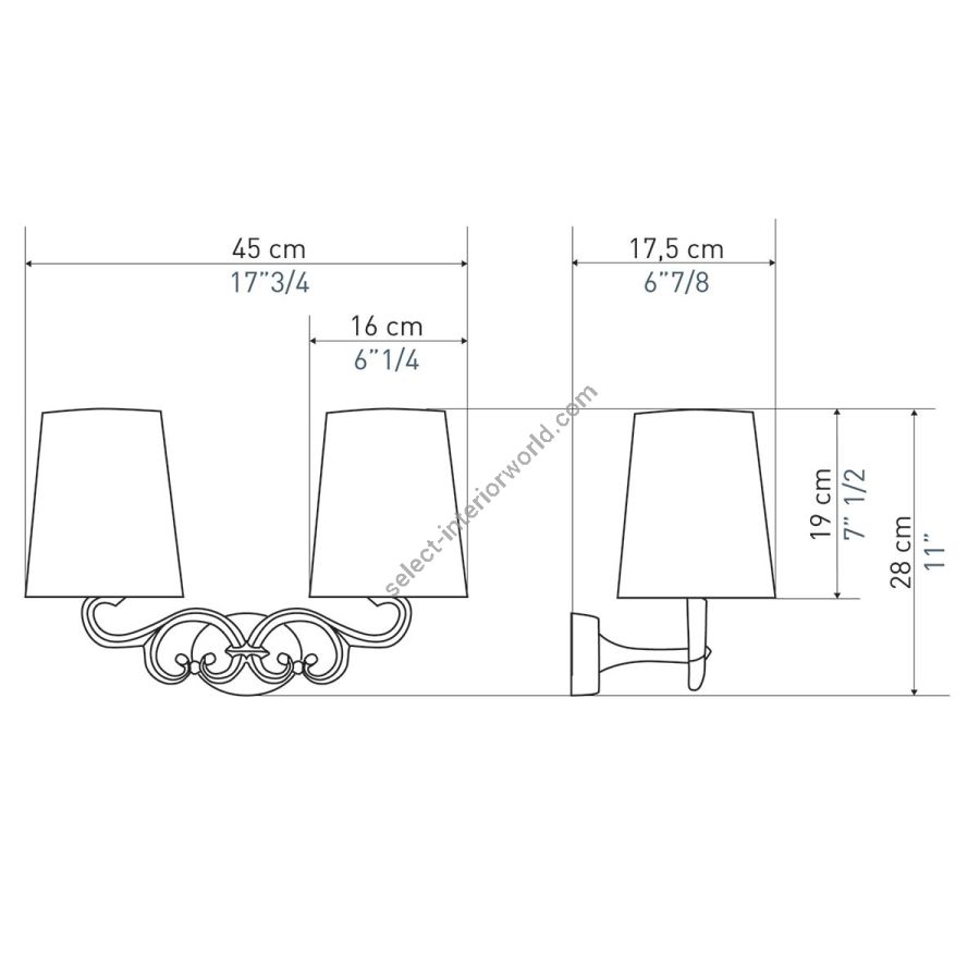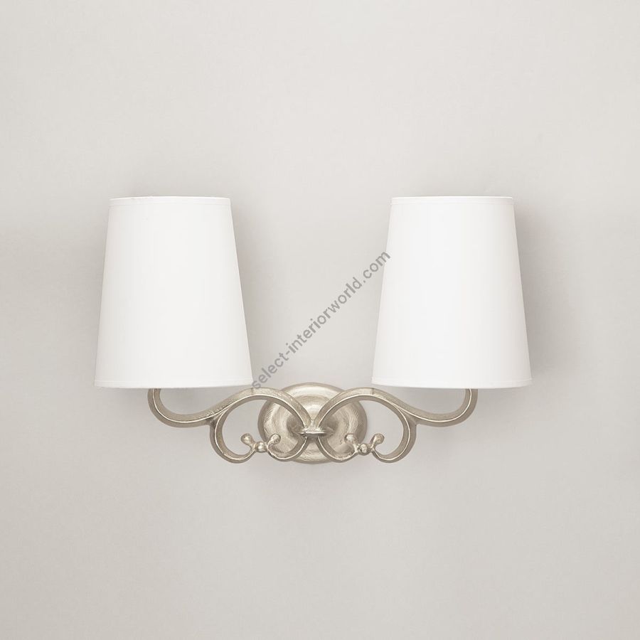 Width: 45 cm, Projection: 18 cm, Maximum: 2 x 40 w, Les Abat-jours peuvent être fabriqués dans 18 coloris au choix, The colour for the shades can be chosen out to 18 different hues