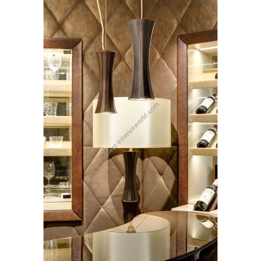 A central composition of curved veneered ebony elements, from which arms with wide curves end in aluminium forks that hold the shades.