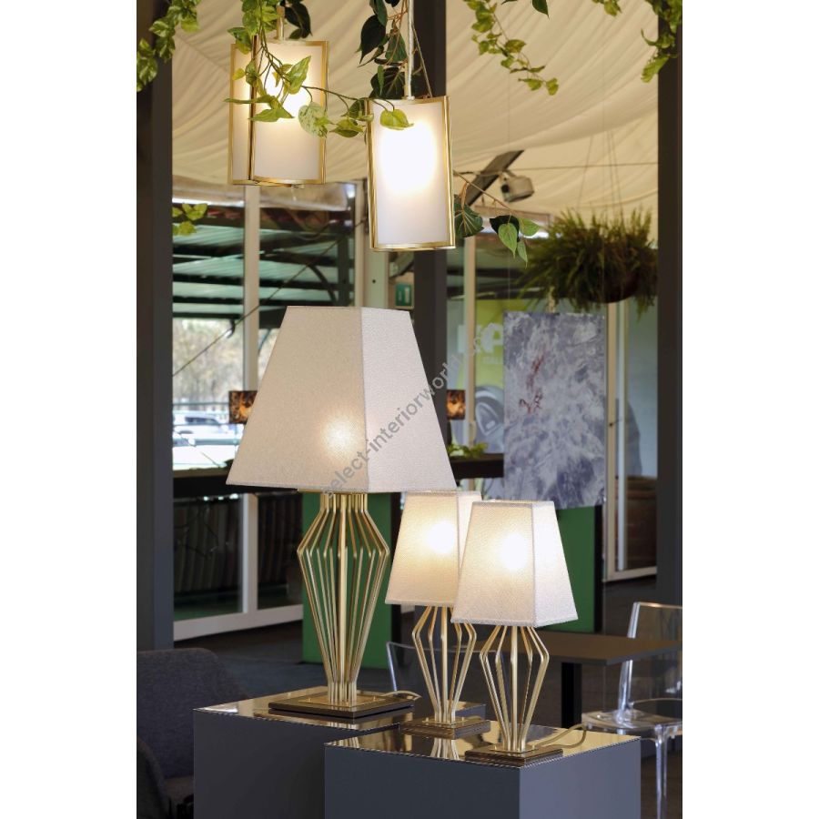 Table lamp with classic colours, but with a strong modern recollection thanks to the many brass rods. They complete the collection and every table of your living room.