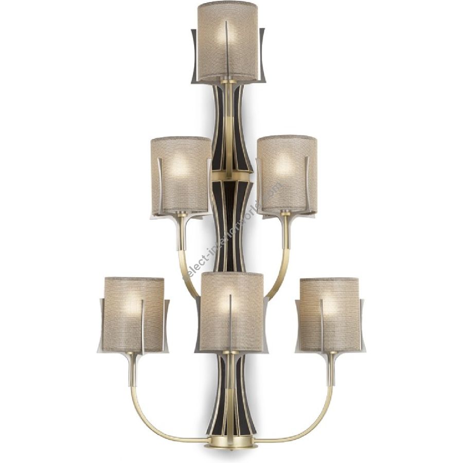 Elegant Wall lamp that furnishes every part of the house. The six lights are positioned on three levels giving a dynamic effect, with arms in natural brass and details in gilded brass. The hues are in gold Trevira Wave fabric.