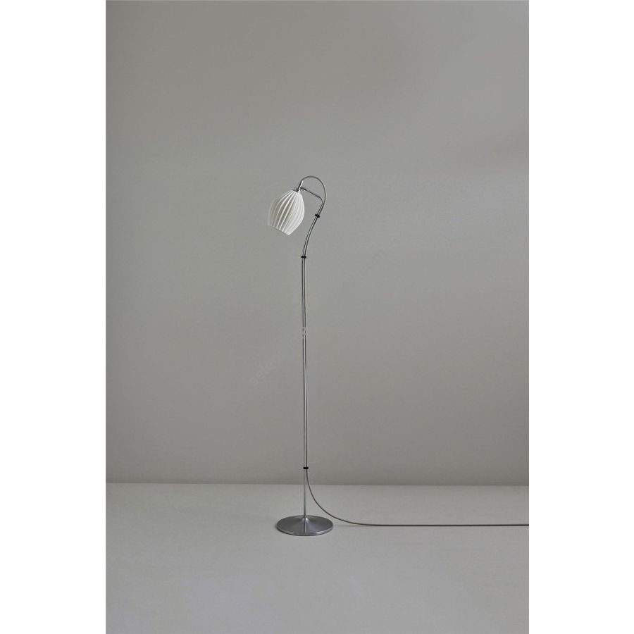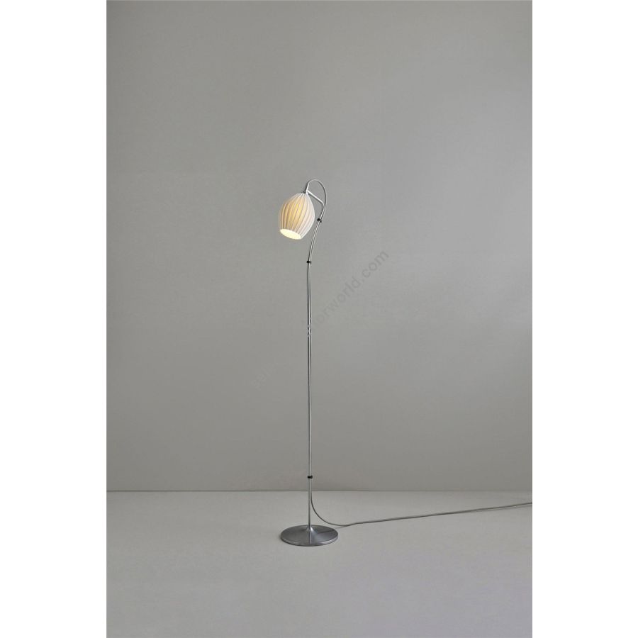 The Fin Floor Light, with its eye-catching bone china shade, moulded into intricate organic shapes, creates dramatic light when lit and sculptural beauty when off. Handmade in Stoke-on-Trent, the distinctive shades are angled onto a satin chrome stem and base. The new grey cotton braided cable complements the style beautifully.