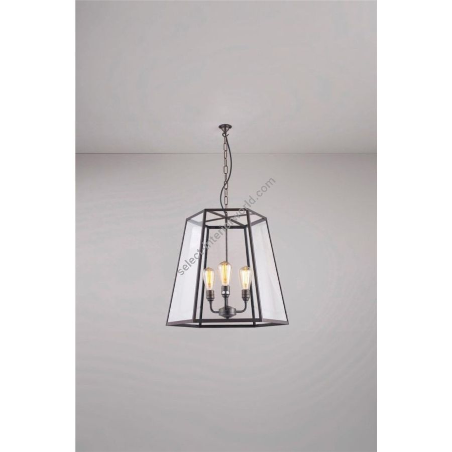 A new, broader based Hex Pendant. This larger sized light has 3 lamps, creating a strikingly architectural silhouette for internal settings. Elegant and robust, the Hex is available in a weathered brass finish, with clear glass panels.