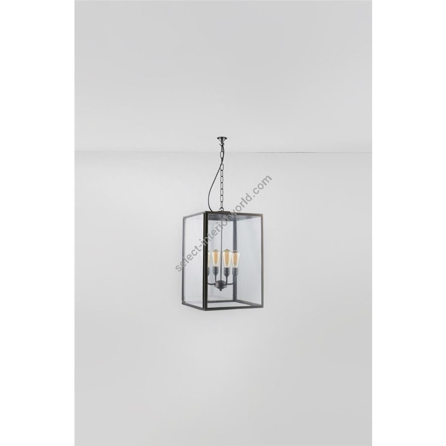 Exterior Square Pendant in weathered brass, externally glazed and available in three sizes. Suspended on a weathered brass hook 1.5 meters of chain. Glass on four sides, with a closed top for exterior use.