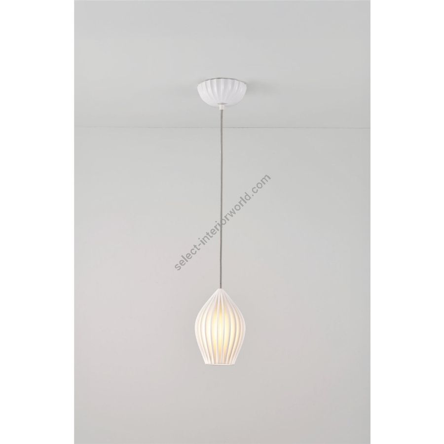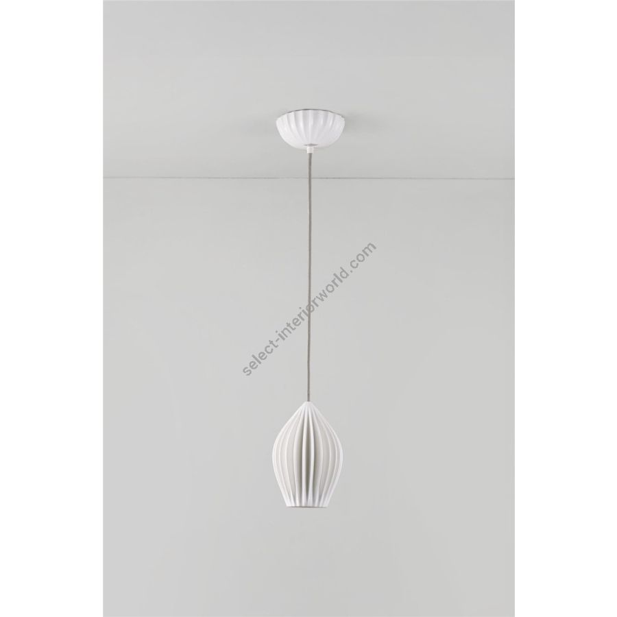 The Fin Pendant is a sophistiacted statement piece. Its bone china shade has been expertly moulded in to beautiful organic shapes, creating dramatic light and shade when lit. Available in three sizes, the lights are complemented by a matching bone china ceiling rose and our trademark cotton braided cable.