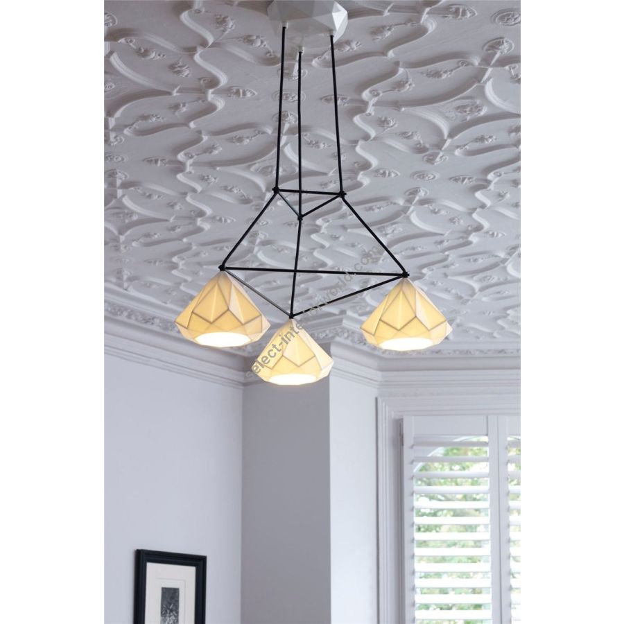 The Hatton 1 Triangular Grouping Pendant is a truly iconic statement piece. Using a highly skilled process, we have been able to transform the bone china shade into an intricate, multi-faceted, gem-like form. When switched 'off' the pendant has an angular sculptural beauty, and when 'on' it provides warm illumination with dramatic lines and shadows.