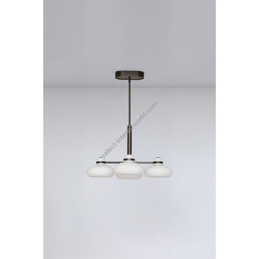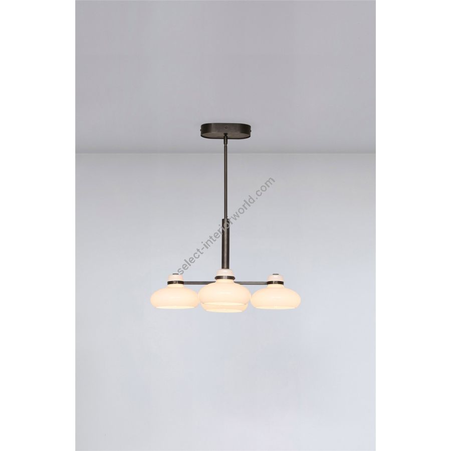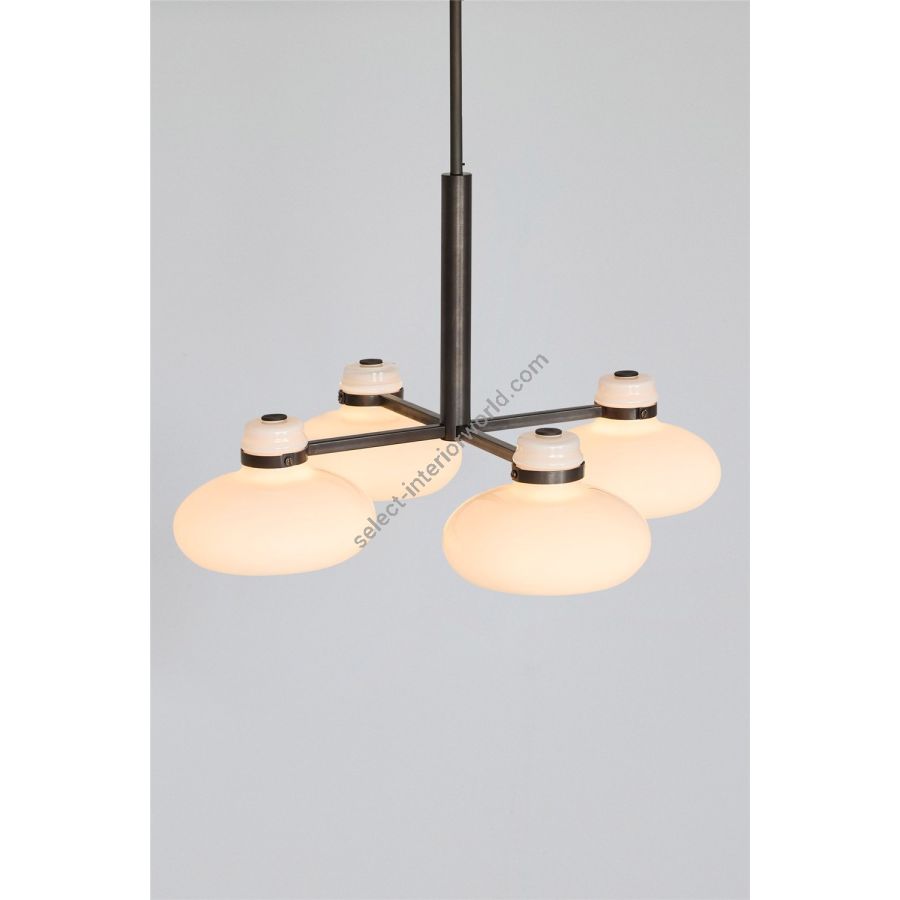 The Magnus pendant captures the fluidity and natural movement of molten glass. Sculptural shades in soft opal white are held in a sleek metal frame in rich blackened bronze. The fixture provides plenty of direct lighting to surfaces below, while the shades emit a warm glow, enriching the atmosphere of any room.