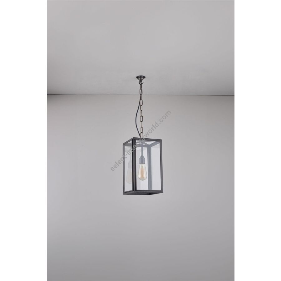 Square Pendant in weathered brass, externally glazed and available in three sizes. Suspended on a weathered brass hook 1.5 meters of chain. Glass on four sides, with open top and base. Suitable for interior use only.