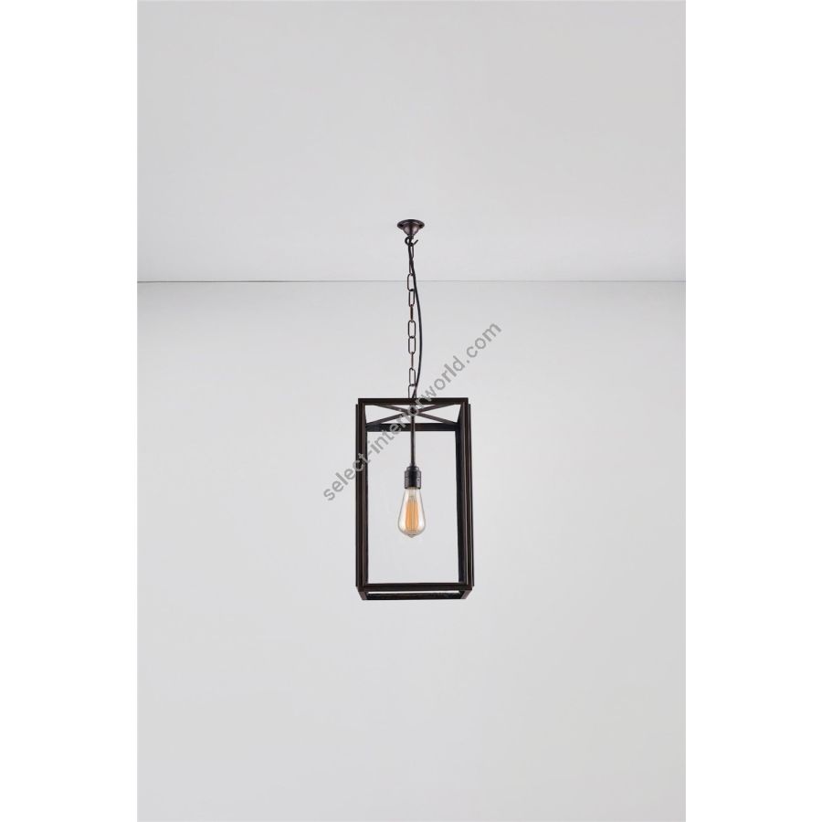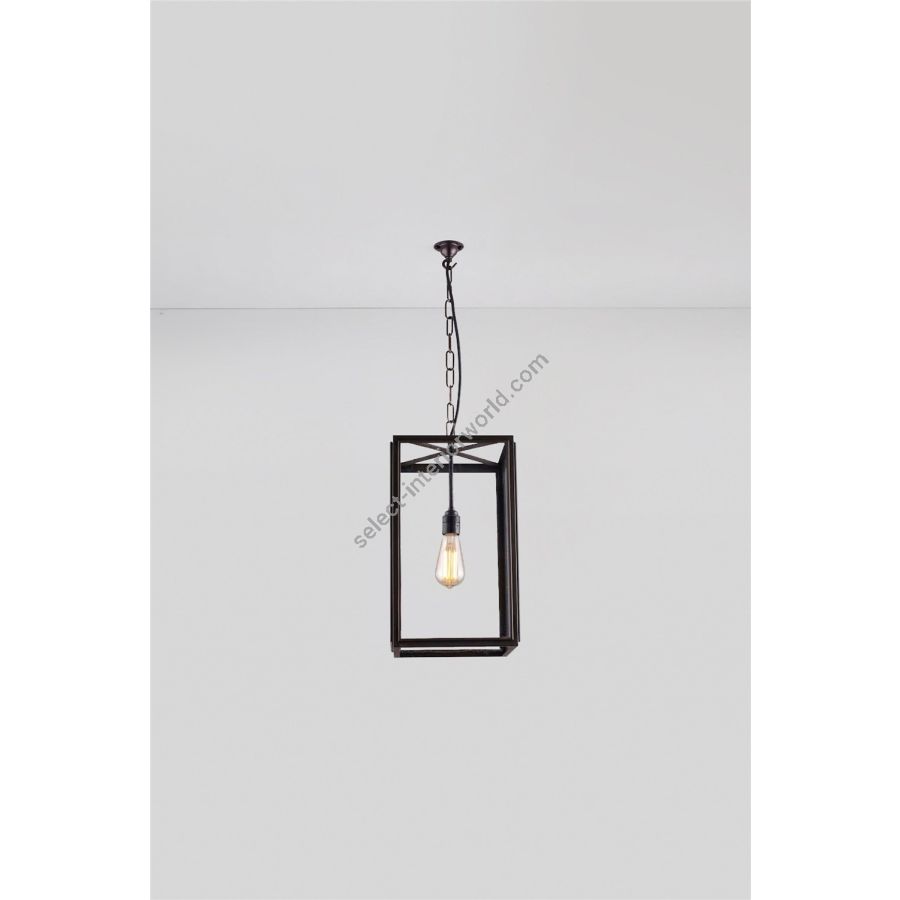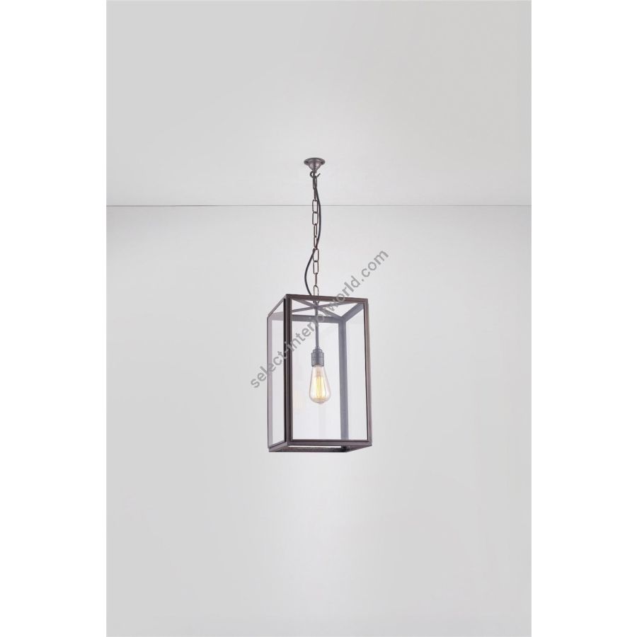 Square Pendant in weathered brass, externally glazed and available in three sizes. Suspended on a weathered brass hook 1.5 meters of chain. Glass on four sides, with open top and base. Suitable for interior use only.