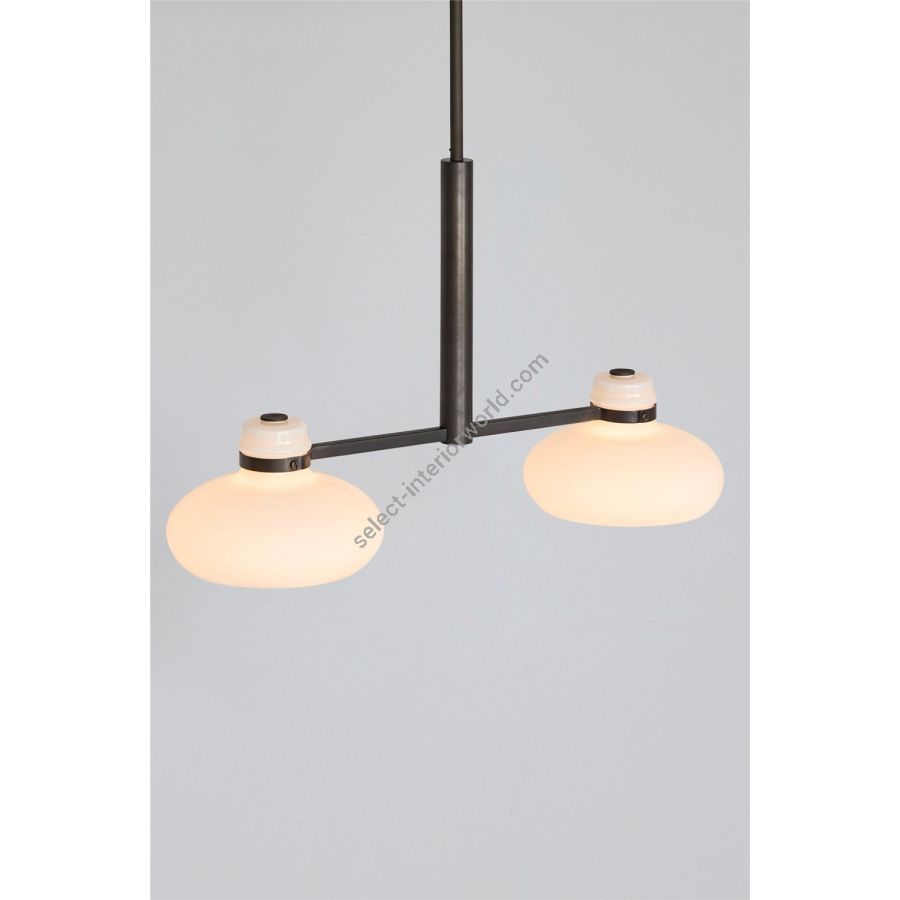 The Magnus pendant captures the fluidity and natural movement of molten glass. Sculptural shades in soft opal white are held in a sleek metal frame in rich blackened bronze. The fixture provides plenty of direct lighting to surfaces below, while the shades emit a warm glow, enriching the atmosphere of any room.