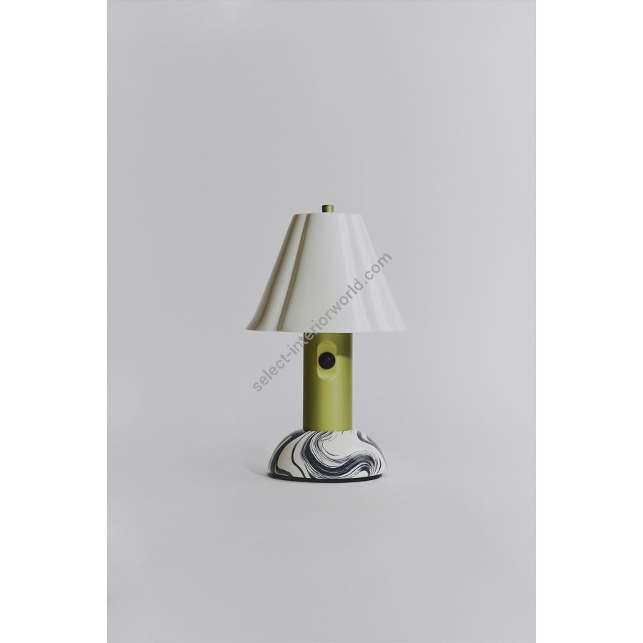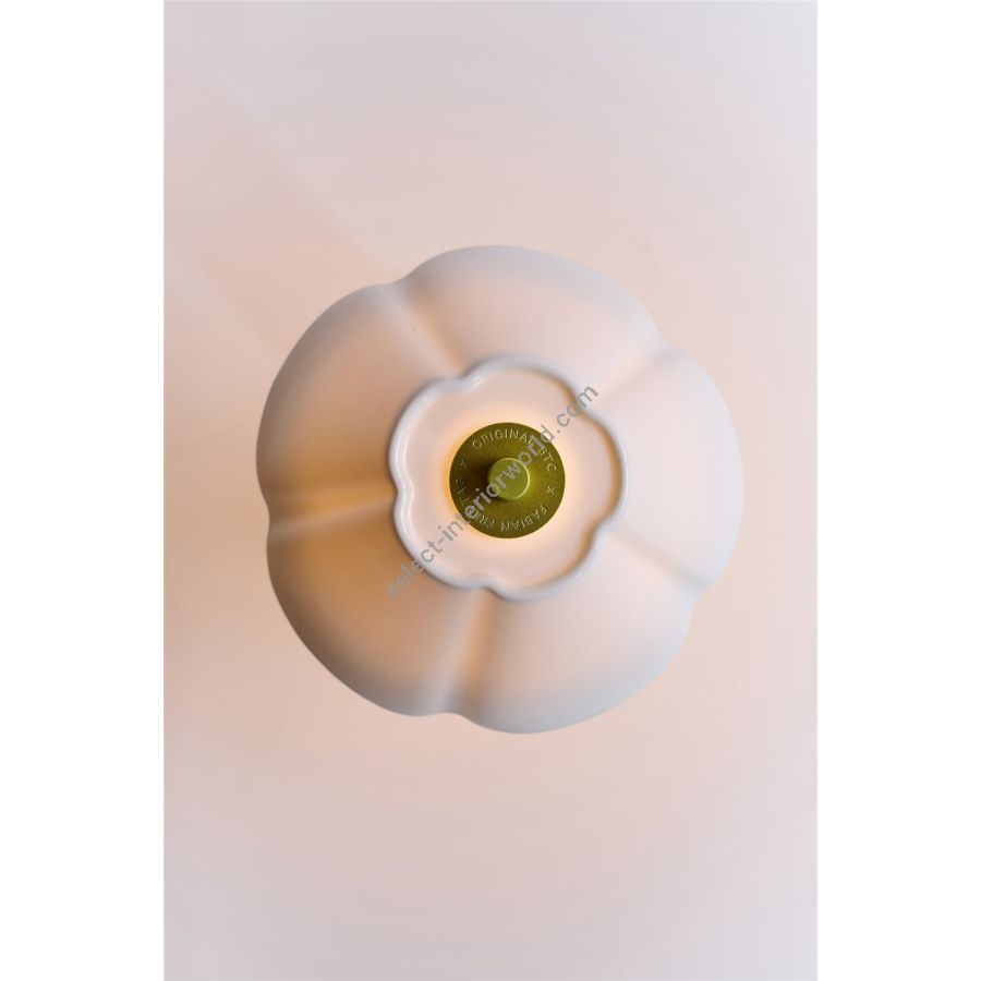 Combining maximalist aesthetics with intriguing contrasts, the Blossom FF Edition brings out a vibrant side of our beloved Blossom portable light. Designed by German designer Fabian Freytag, it showcases a striking monochrome, marble-like hydro-dipped base, highlighted by an iridescent green stem and our signature fluted bone-china shade. It's topped off with a metal disc in matching green spelling out Original BTC x Fabian Freytag – a special detail of Blossom FF.
