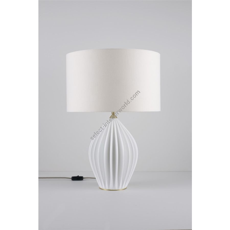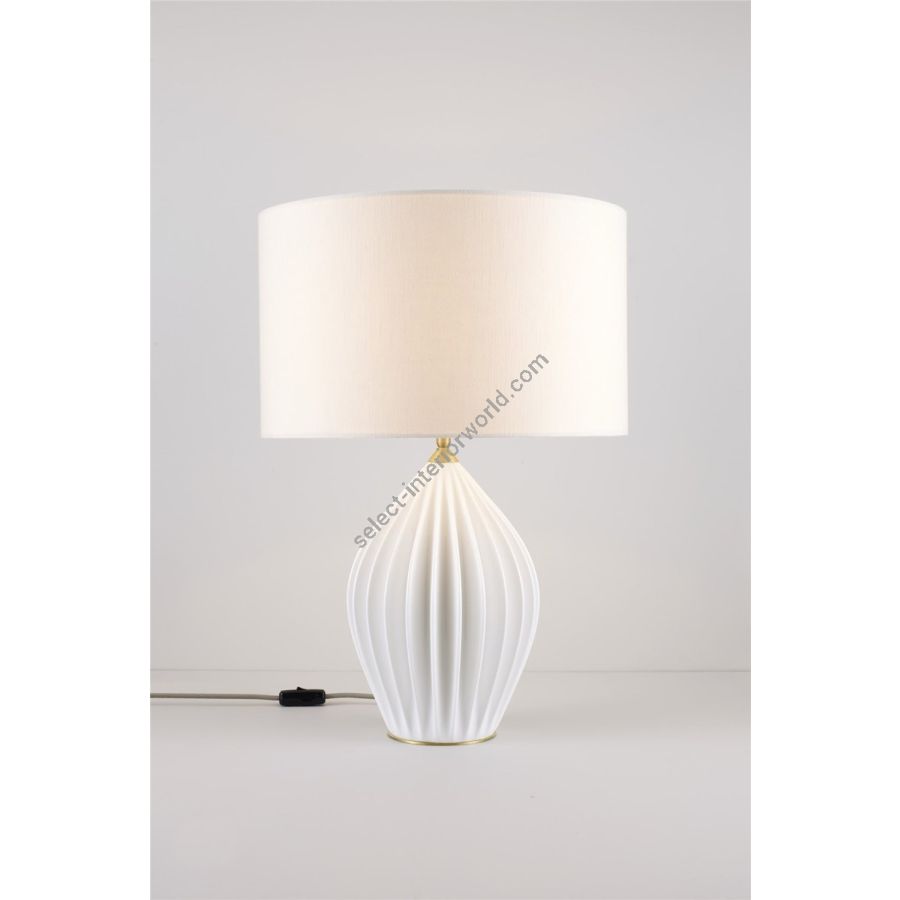 The Fin King Table Light marks a new direction for Original BTC, combining our trademark bone china with the addition of a drum shade. The ivory linen shade casts a soft, diffused light, creating beautiful shadows on the intricate hand slip-cast base. The Fin is finished with lacquered, brushed solid brass details and signature cotton braided cable in a pale grey, while the shade sits on an angleable ball and socket to facilitate reading.