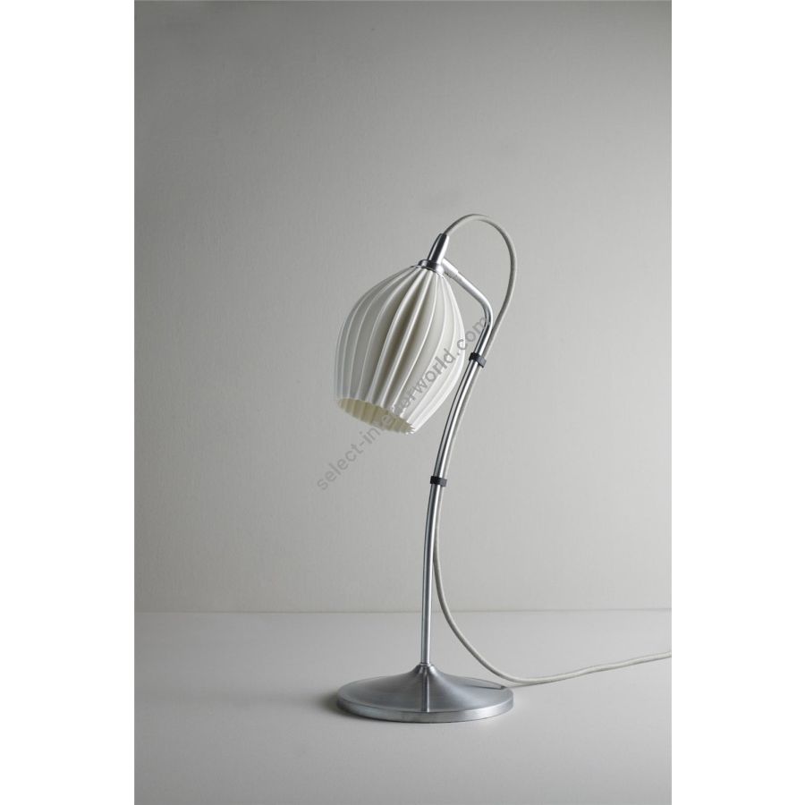 The Fin, with its eye-catching bone china shade, expertly moulded into intricate organic shapes, creates dramatic light when lit and retains a sculptural beauty when off. Handmade in Stoke-on-Trent, its distinctive shade is angled onto a satin chrome stem and base. The new grey cotton braided cable, with an inline switch, complements the style beautifully.