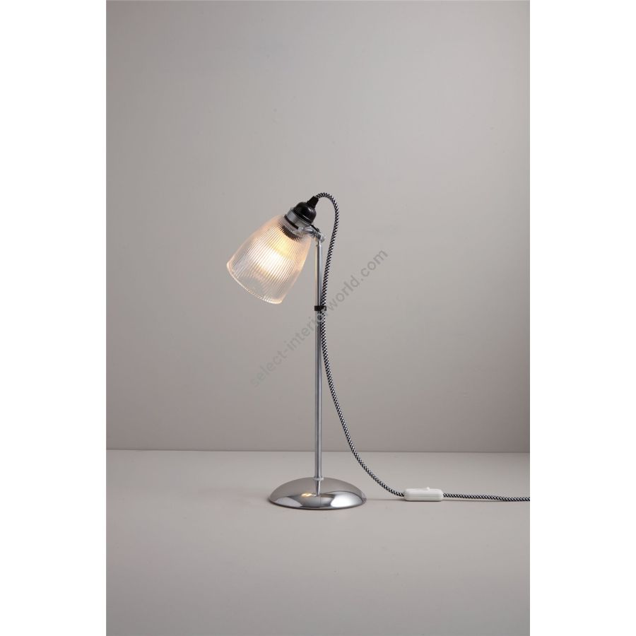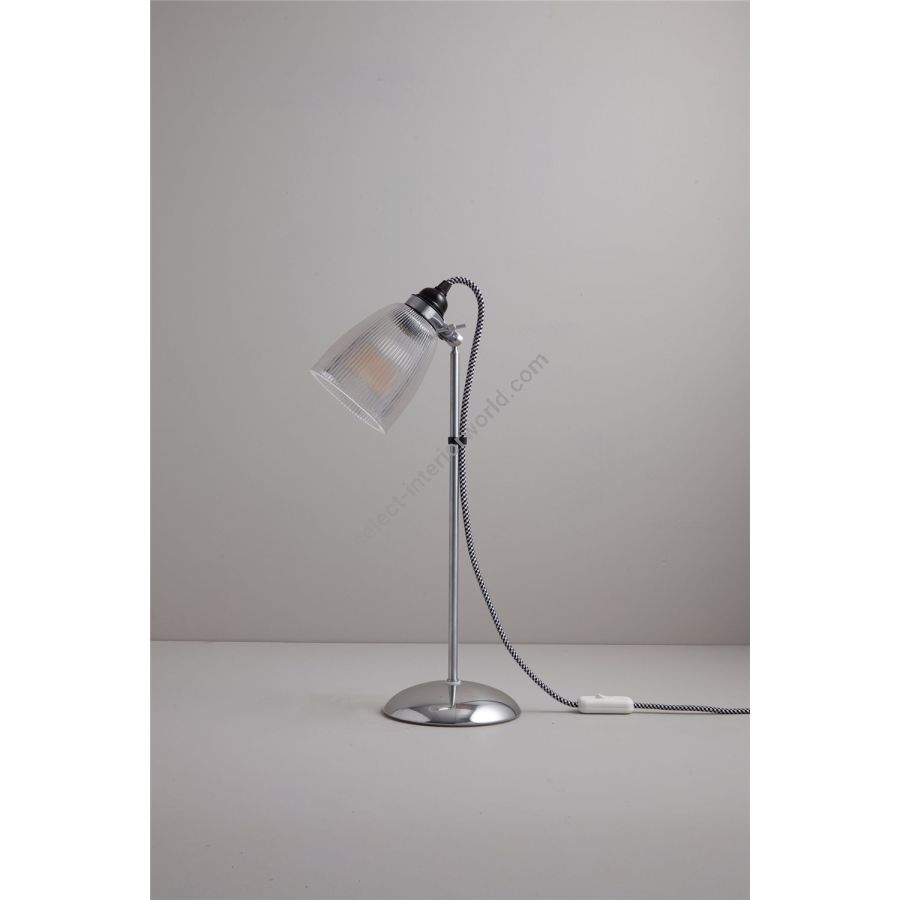 Our Primo Table Light features a unique black & white cotton braided cable, sleek chrome arm and base, and an intricate glass prismatic shade that gently diffuses light. Also available as a floor light.