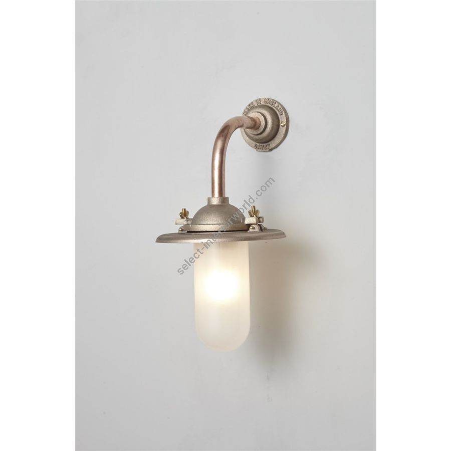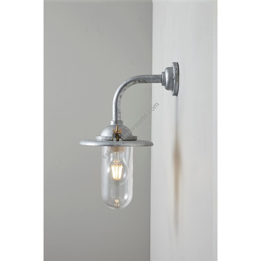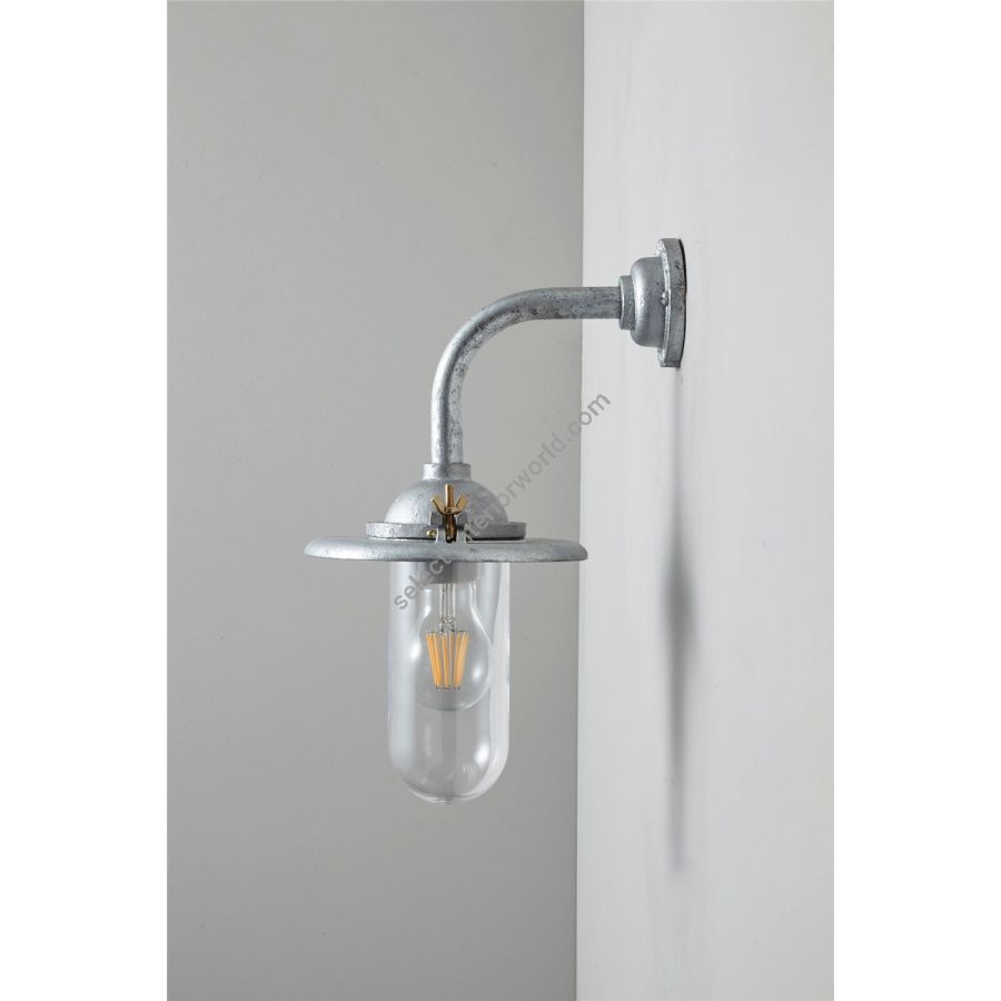 An Exterior Bracket Light with a heavy cast reflector that's held by brass wing nuts and bolts for easier access to the lamp. This industrial wall light is available in either galvanised cast iron or sandblasted bronze, with a canted or right angle arm. Glass is clear or frosted.