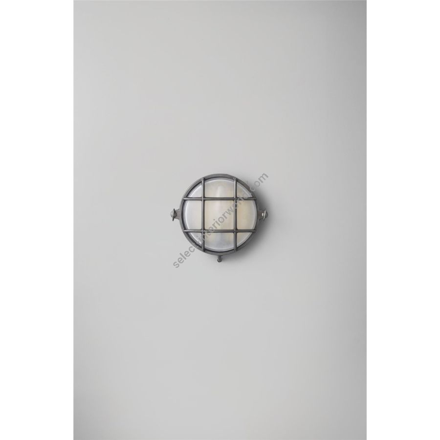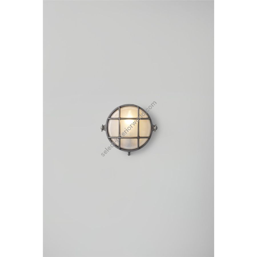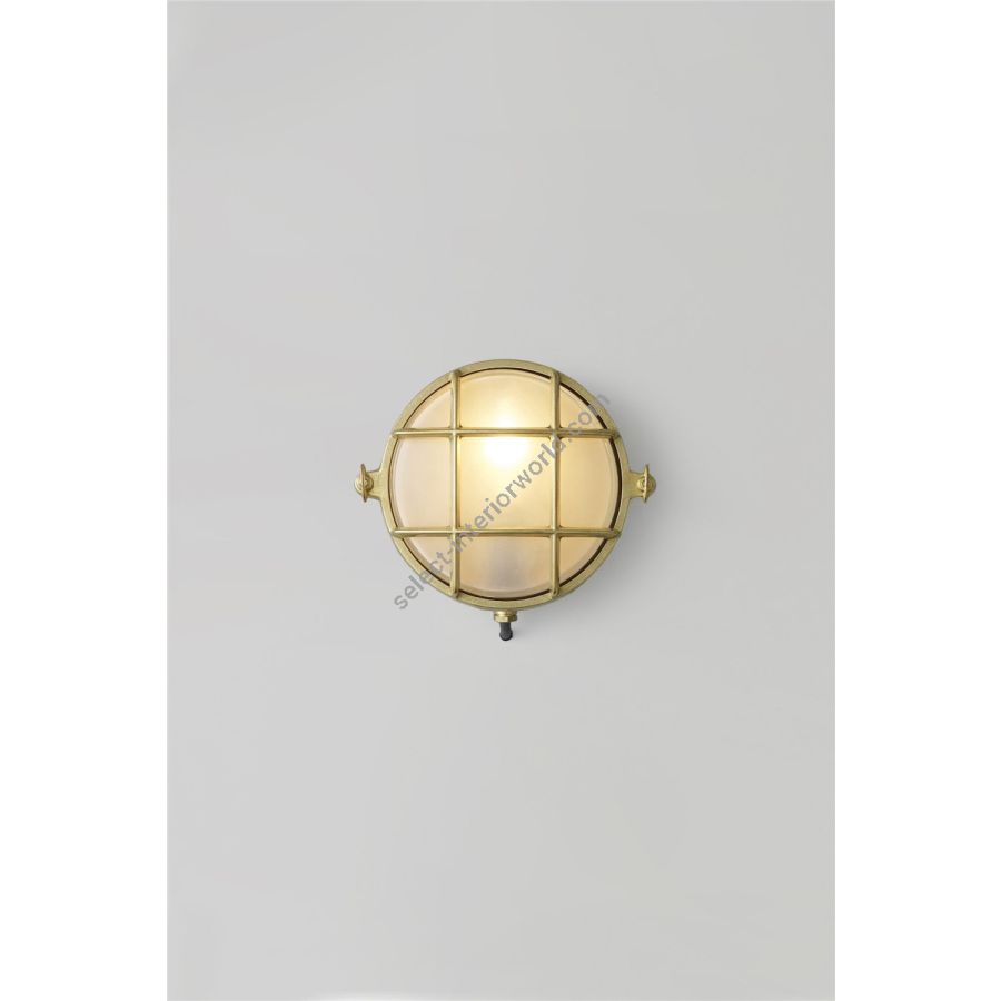 A small die-cast bulkhead light in natural brass (unlacquered) and with frosted glass diffuser. Also available in weathered brass and a chrome plated finish. Front guard secured by two wing nuts, dome nuts optional by request. Glanded surface cable entry.