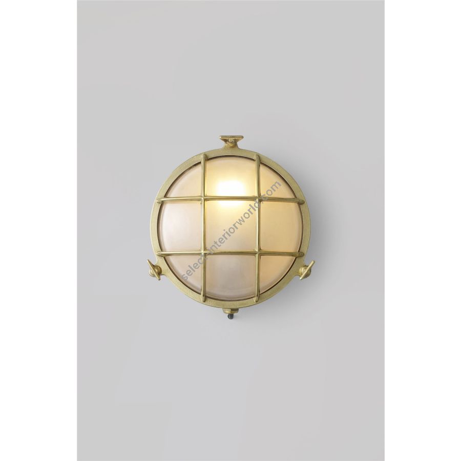 A die-cast bulkhead light in natural brass (unlacquered) with frosted glass diffusers. Also available in weathered brass and a chrome plated finish. Front guard secured by three wing nuts. Glanded surface cable entry.
