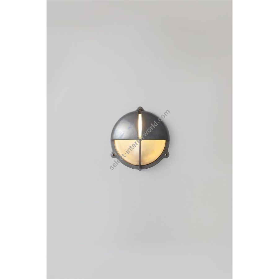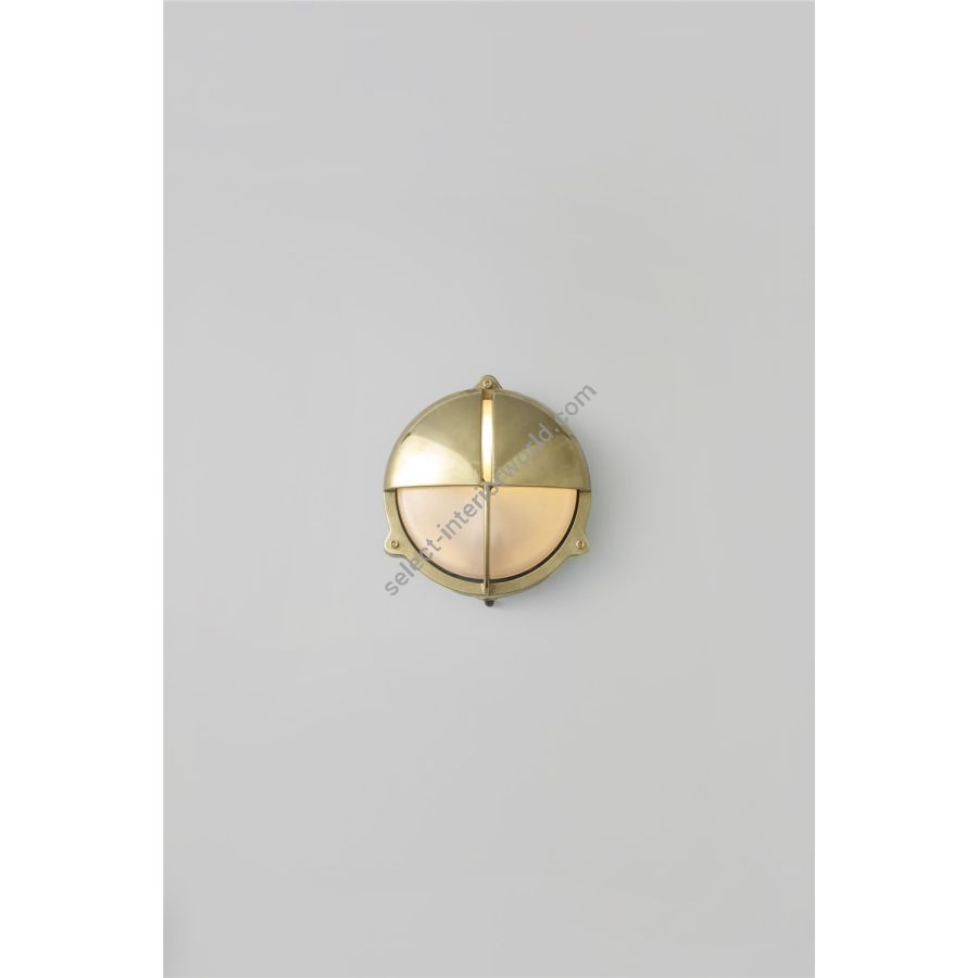 Die-cast bulkhead light in natural brass, unlacquered with frosted diffusers and eyelid shield, secured with socket head screws. Also available in weathered brass and chrome plated finishes and two different sizes. Glanded surface cable entry.