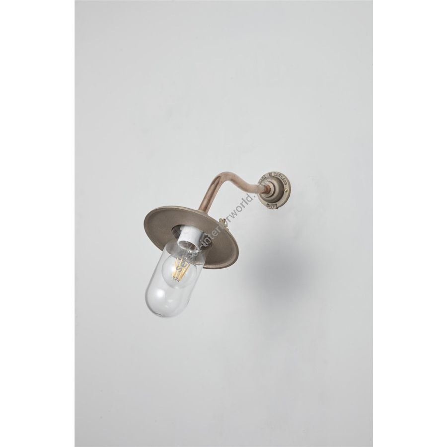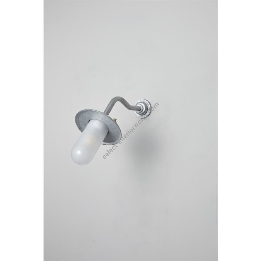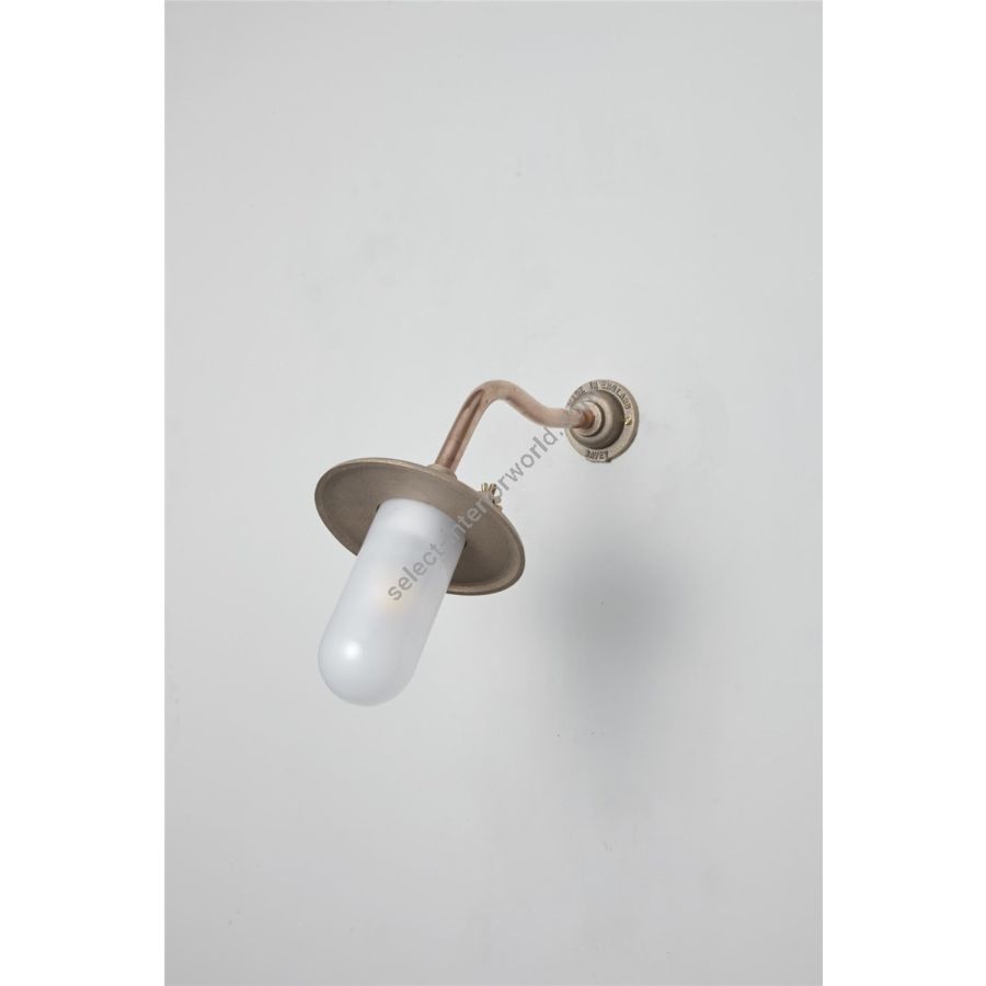 An Exterior Bracket Light with a heavy cast reflector that's held by brass wing nuts and bolts for easier access to the lamp. This industrial wall light is available in either galvanised cast iron or sandblasted bronze, with a canted or right angle arm. Glass is clear or frosted.