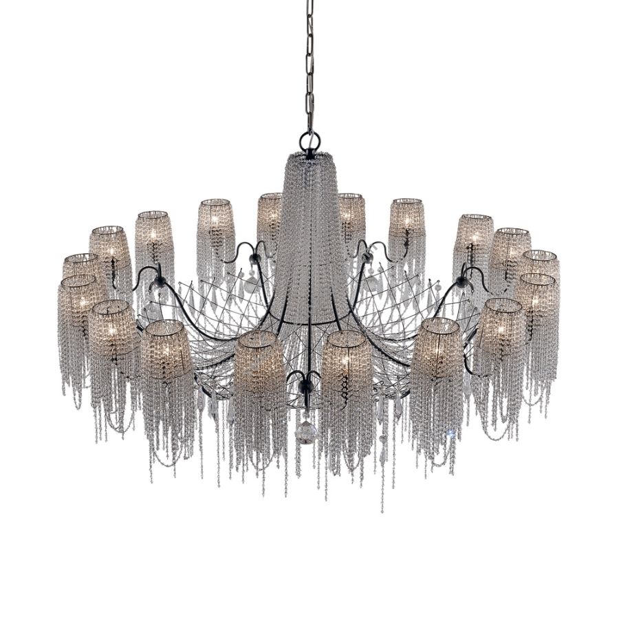The strings of crystals are exclusively transparent and enriched by irregular elements of different shapes. A coup de theatre of great effect.