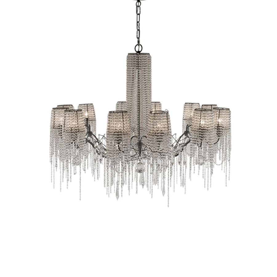 The strings of crystals are exclusively transparent and enriched by irregular elements of different shapes. A coup de theatre of great effect.