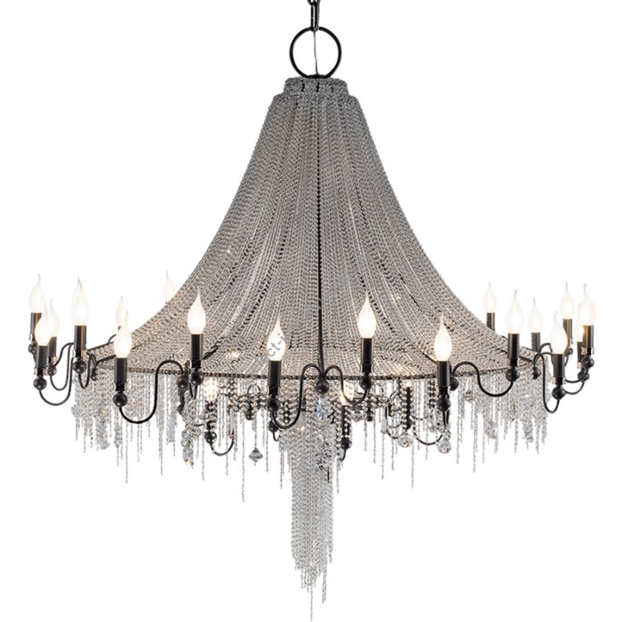 The strings of crystals are exclusively transparent and enriched by irregular elements of different shapes. A coup de theatre of great effect.
