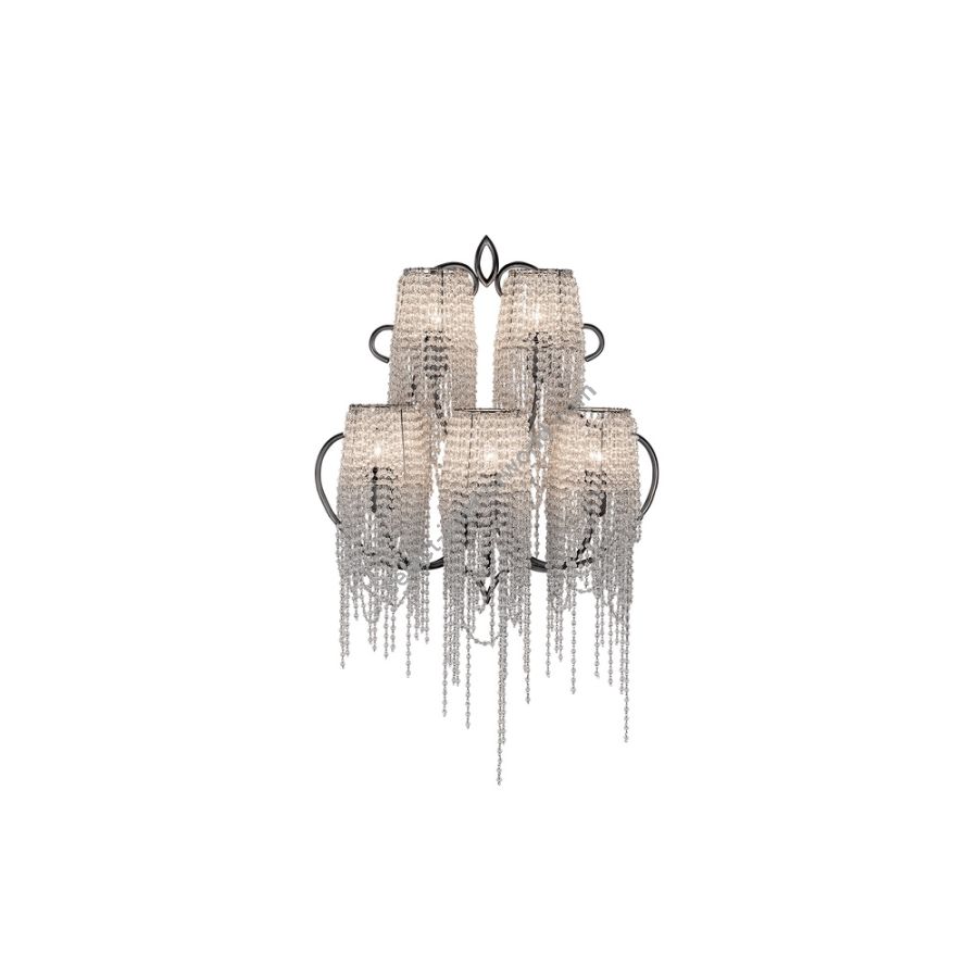 The strings of crystals are exclusively transparent and enriched by irregular elements of different shapes. A coup de theatre of great effect.