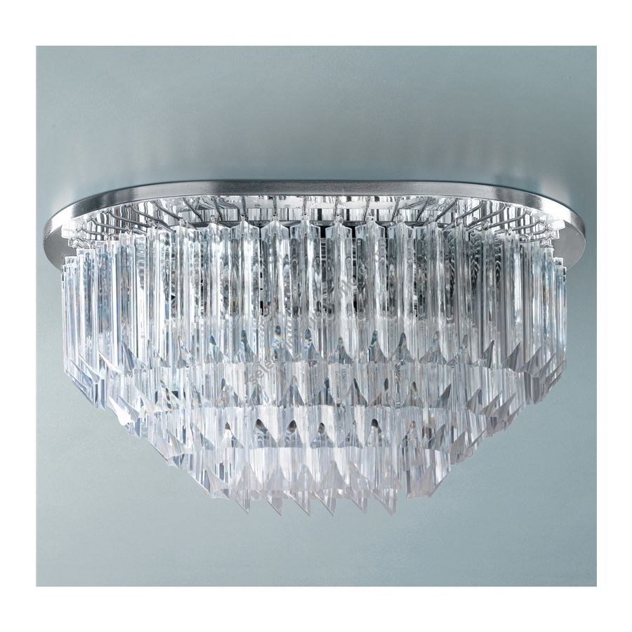 Ceiling lamp with crystal trihedrals or trihedrals and quadrihedrals in murano glass, available in many colours and a frame in 24 karat polished gold or chrome.