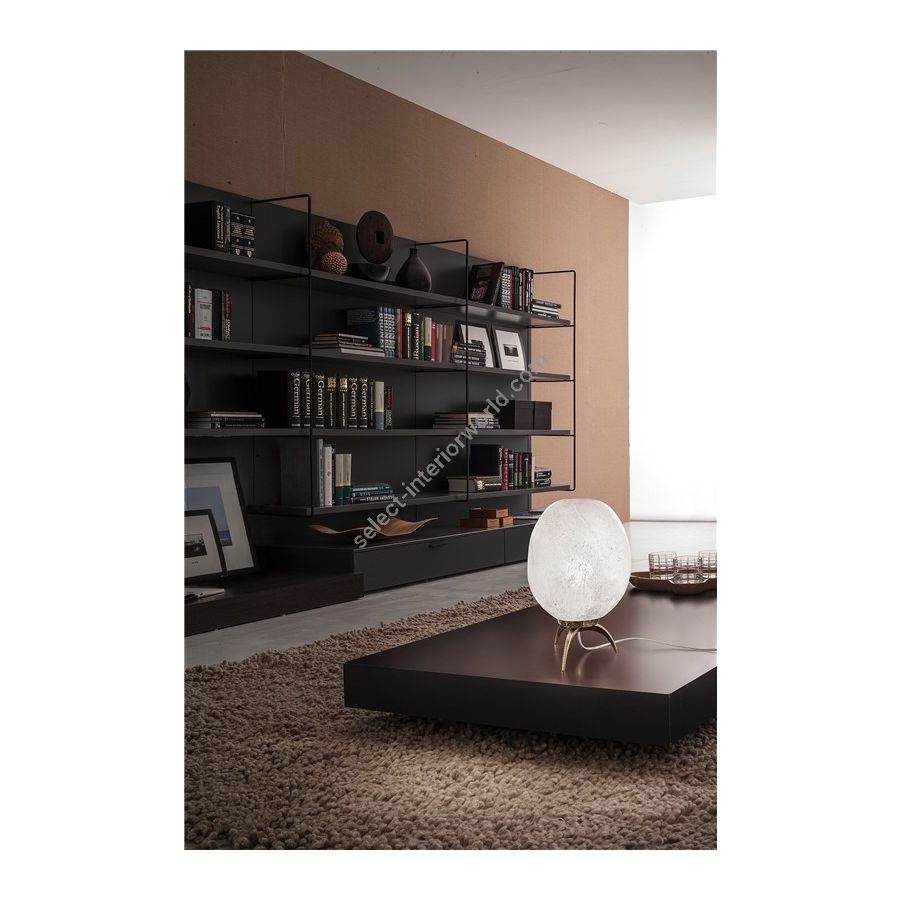 The metal frame, which is very minimal and discreet to emphasise the glass at its best, is refined with a burnished brass or champagne finish.