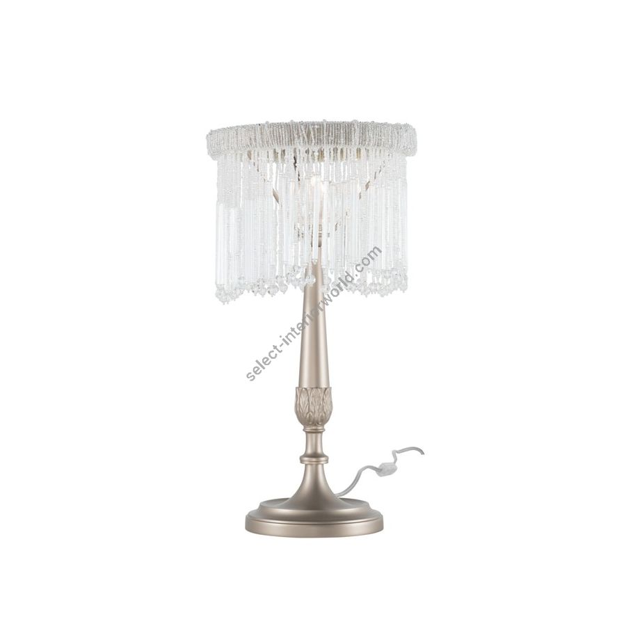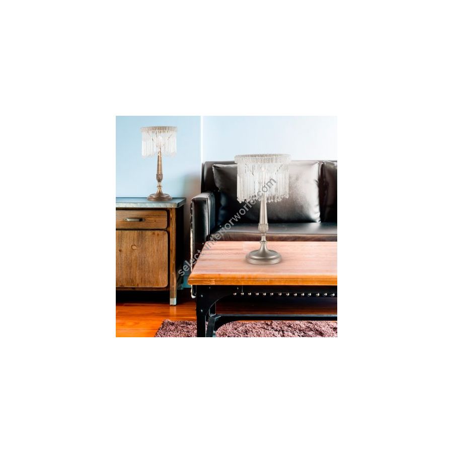 Table lamp with a handcrafted fringe formed by murano glass clear or amber beads and a frame in bronze, dove grey or grey.