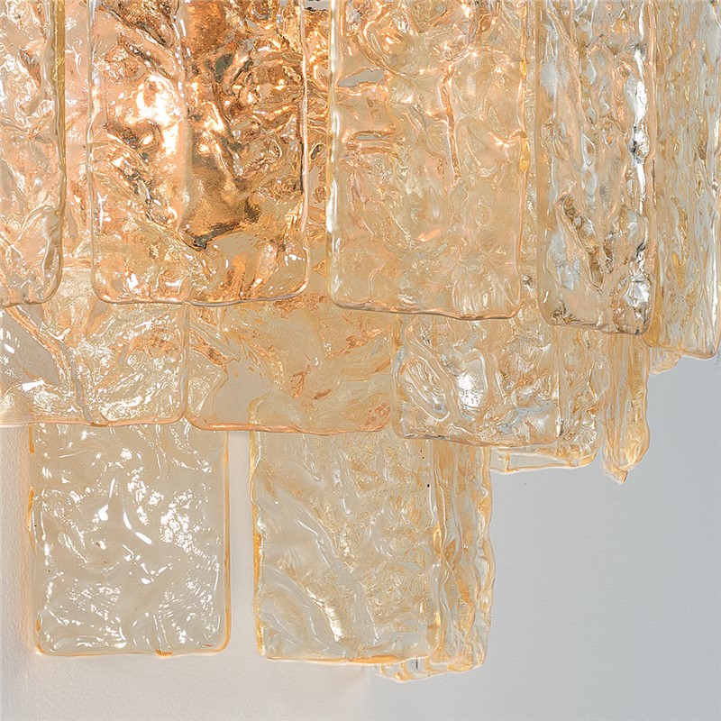 The decorative elements are plates in murano glass shaped through specific moulds and hammered by hand, avaialble in the following finishes: clear, amber, smoked..