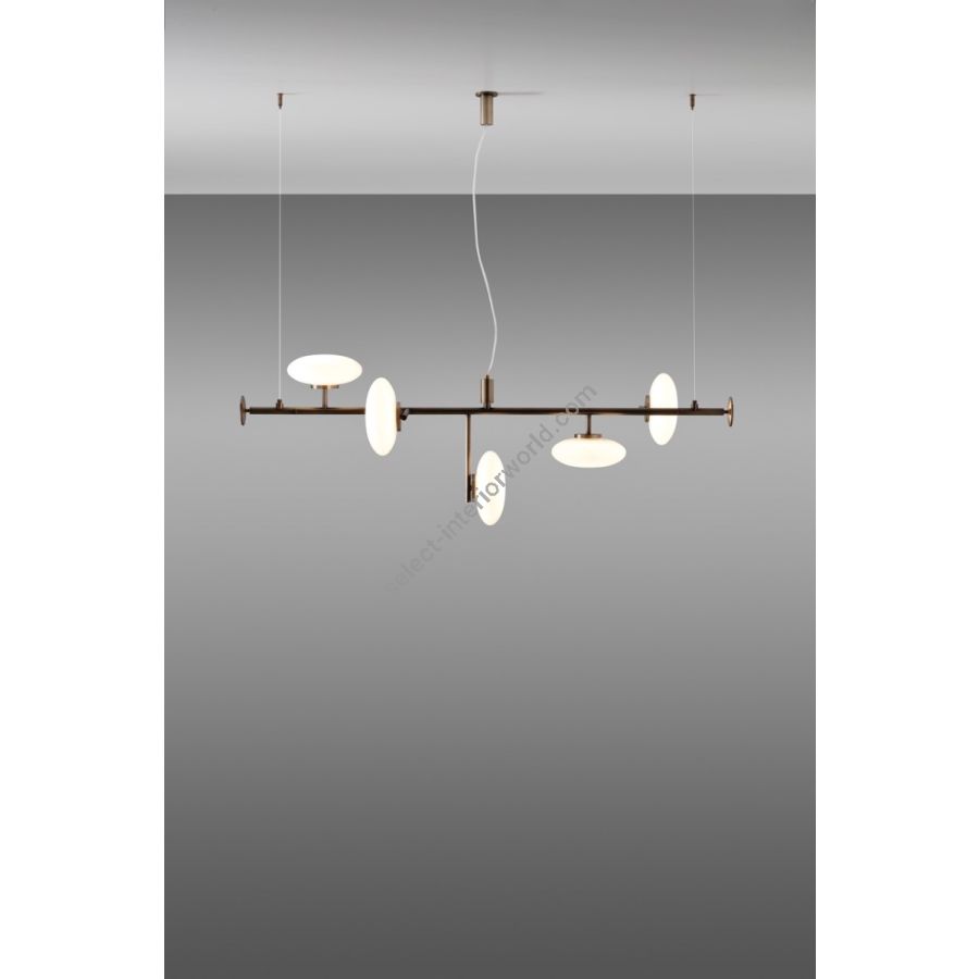 Lamps with structure in matt black varnished metal or brushed bronze. Shade in white blown glass.