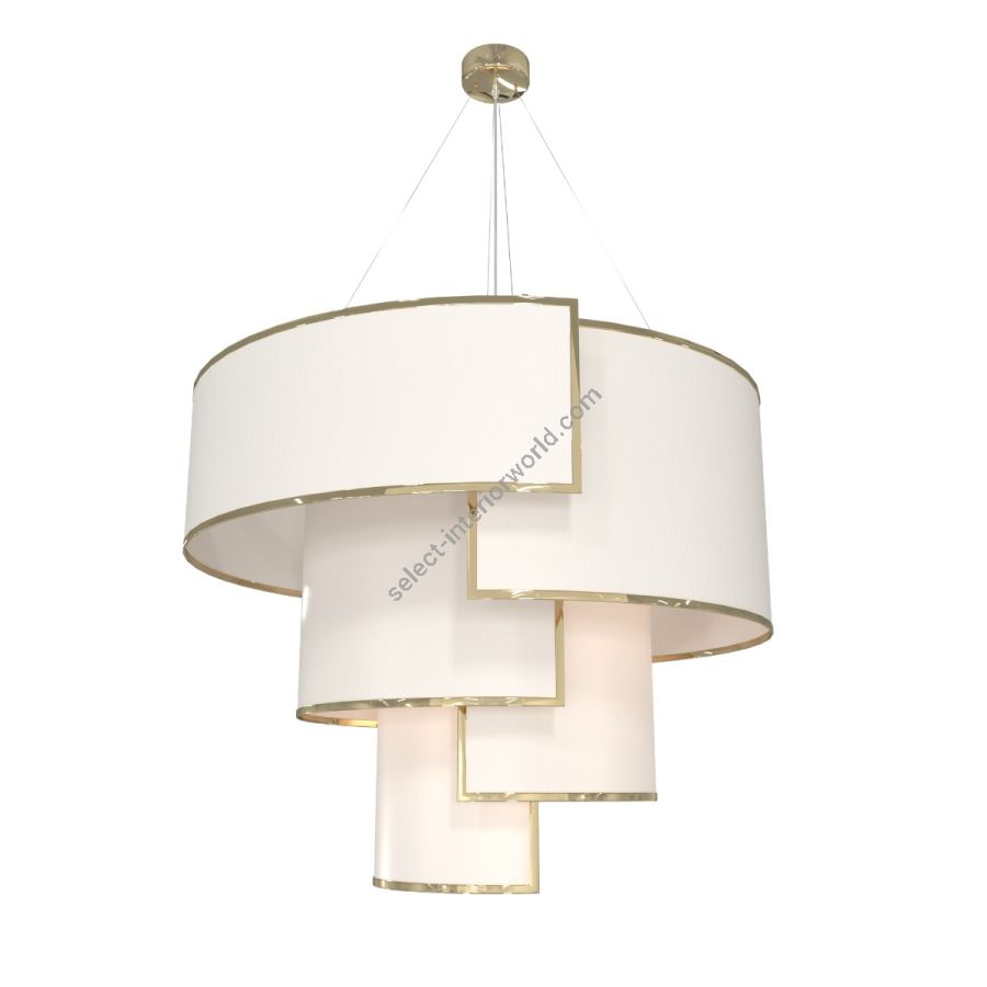 Chandelier in polished brass alternating with old gold finishing with Ivory fabric. Lighting item that diffuses the light with great effect in the surrounding environement creating a warm and welcoming atmosphere.