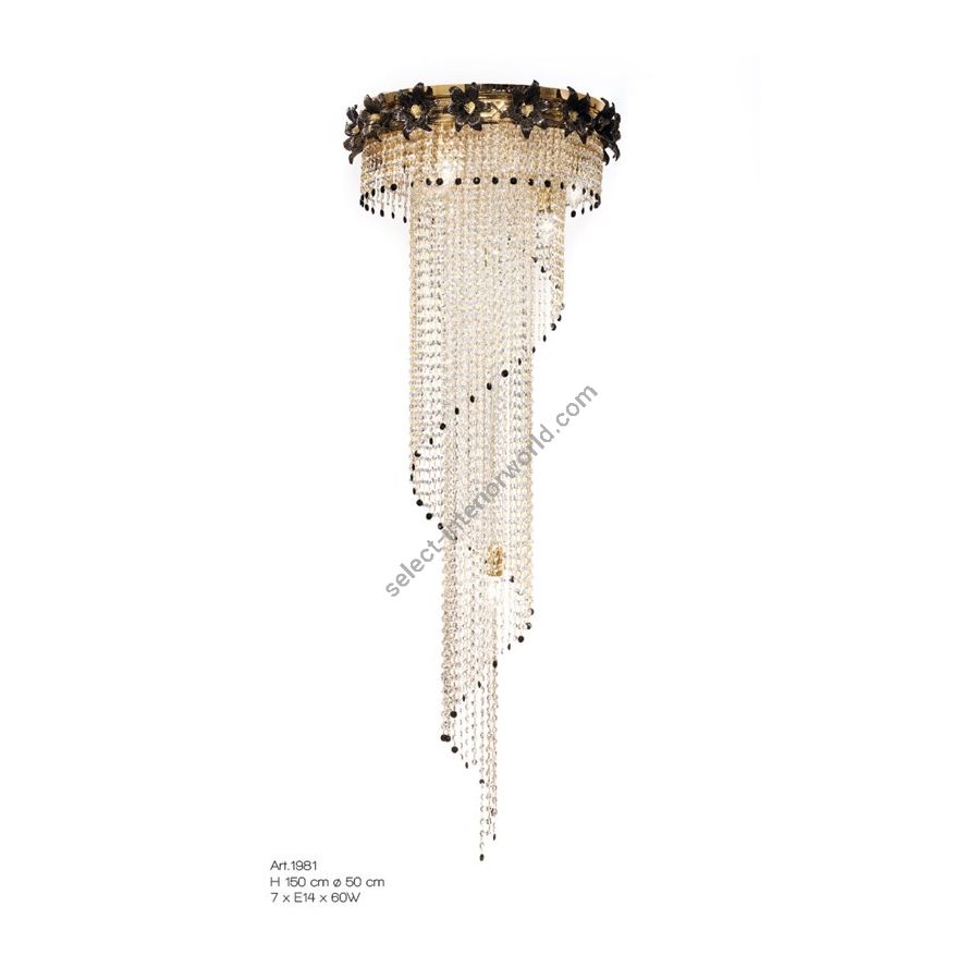 Cascade chandelier in Asfour crystals and black Murano glass flowers. Lighting item that diffuses the light with great effect in the surrounding environement creating a warm and welcoming atmosphere.