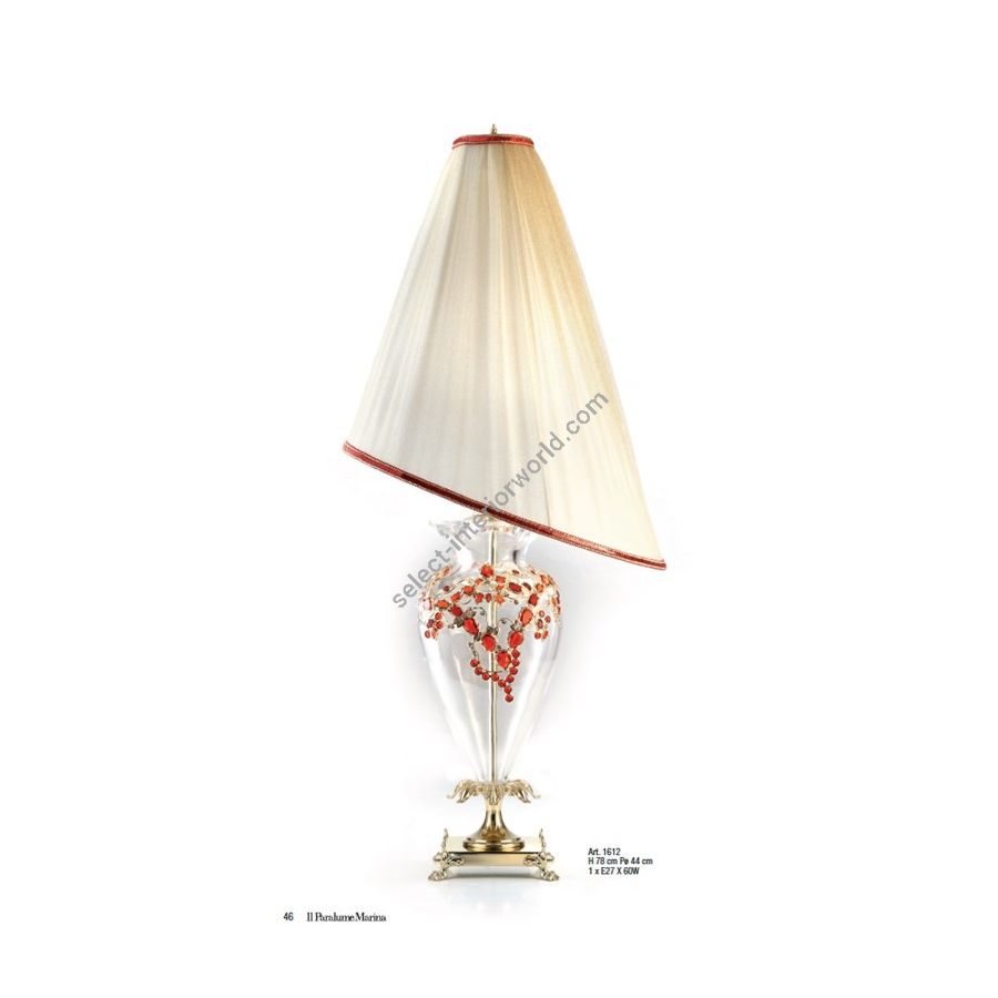 Table lamp in Florentine crystal with red jewel decoration, lampshade in double fabric. Lighting item that diffuses the light with great effect in the surrounding environement creating a warm and welcoming atmosphere.
