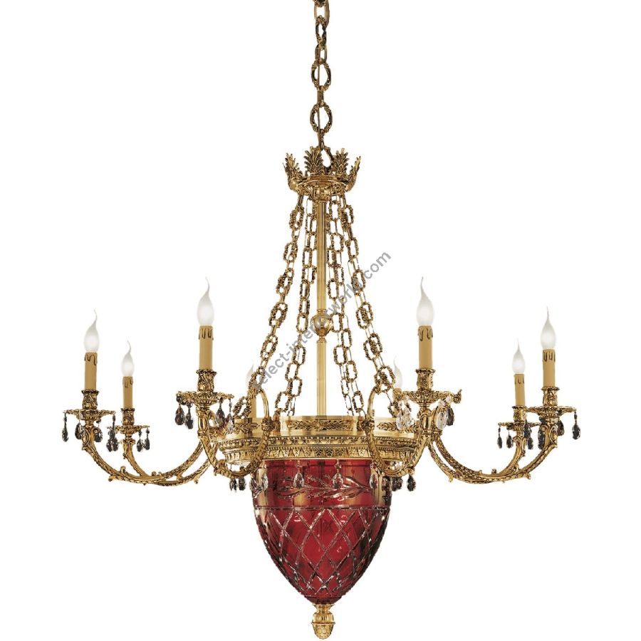Shaded gold plated finish chandelier with red crystal and Schoeler drops