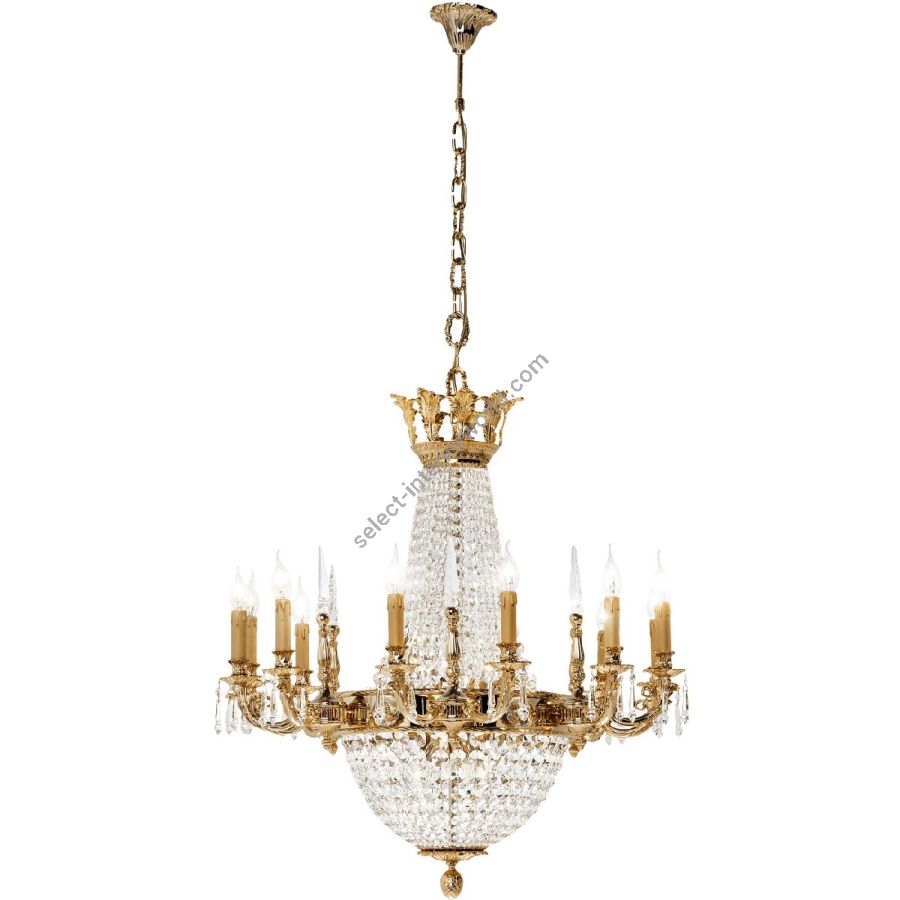 A great classic of the Empire style made of brass with a pure gold finish, with Schoeler crystals and crystal details in the metal band, this chandelier can also be made in large sizes.