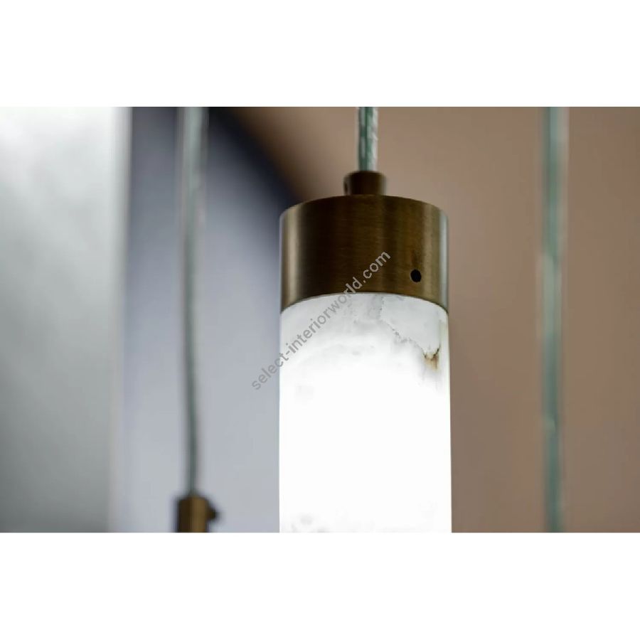 The alabaster tubes and spheres supported by simple brass parts in a light satin finish form a suspension where the elements are placed at different heights. Simple and essential shapes where the lighting enhances the natural veins of alabaster. Each piece is different from the other, a gift from nature to embellish rooms of every era and style from the most classic to the design.