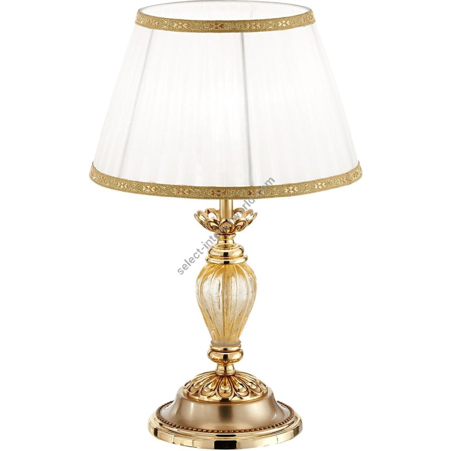 Complete collection made of brass with French gold or satin finish with amber 'Craqué' glasses. Chandeliers in various sizes, wall lamps, table and floor lamps with ivory pleated organza lampshade are available. Customizable in finishes and sizes.