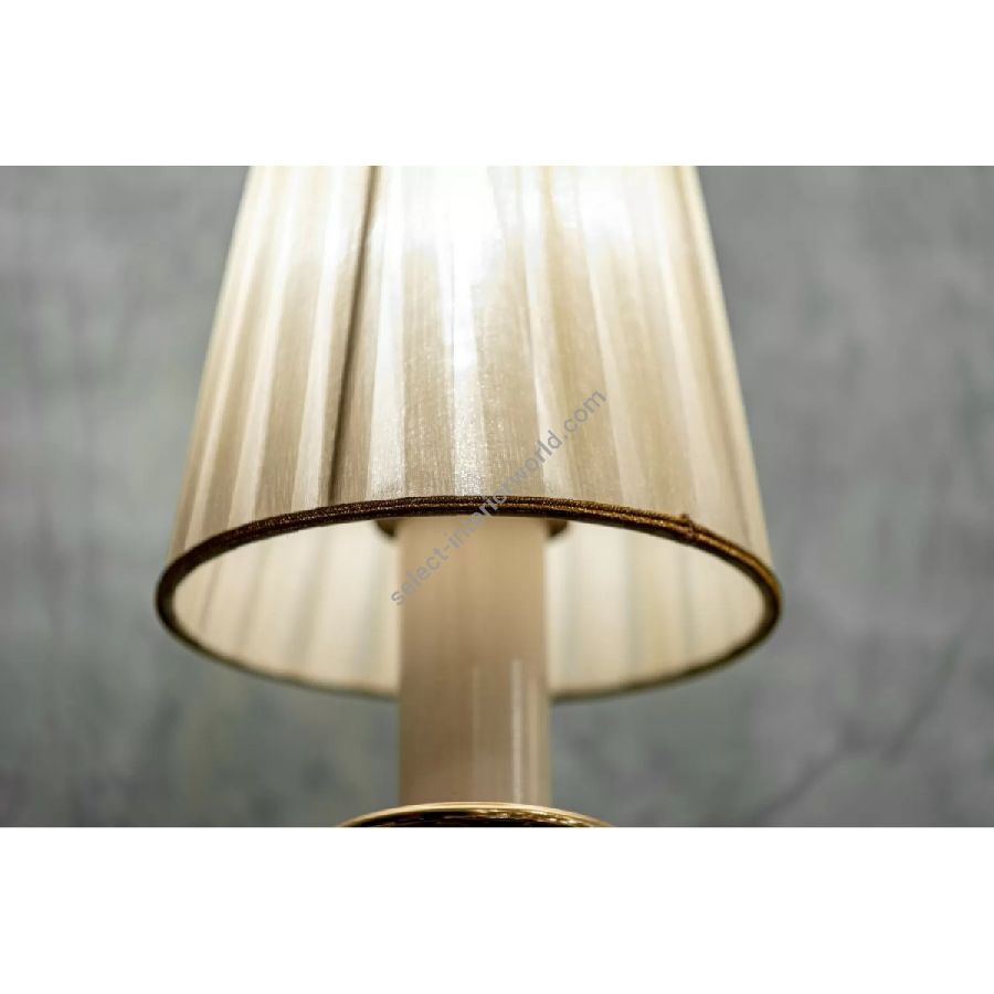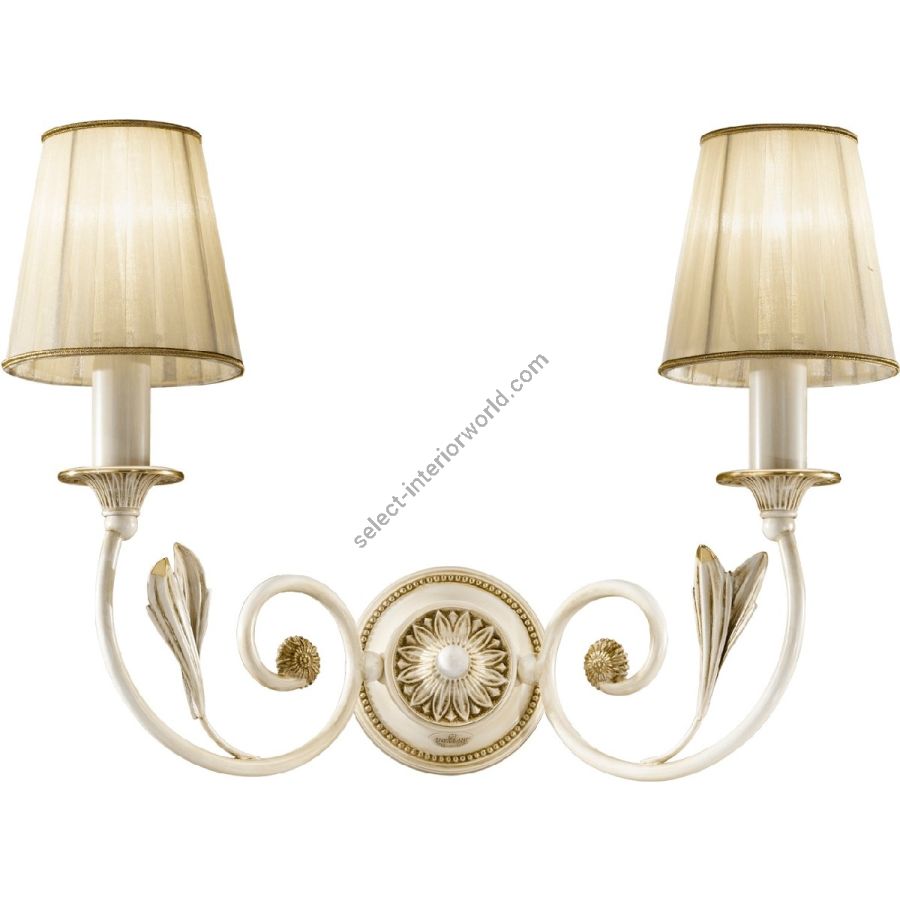 This delightful collection made up of chandeliers, wall lamps and table lamps has a constant decorative element in the shape of a leaf that enriches the arms and the central column and the particular Antique White and Gold finish enhances the details. The combination with organza lampshades in cream color makes it very sophisticated and elegant. Customizable in finishes and sizes.