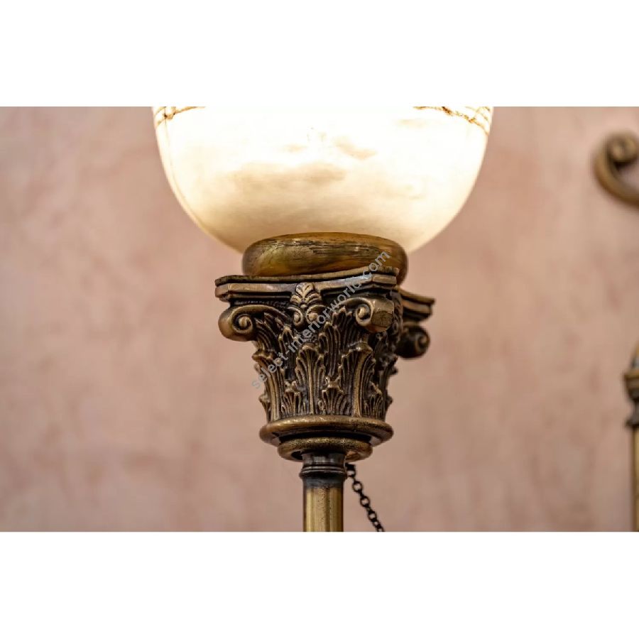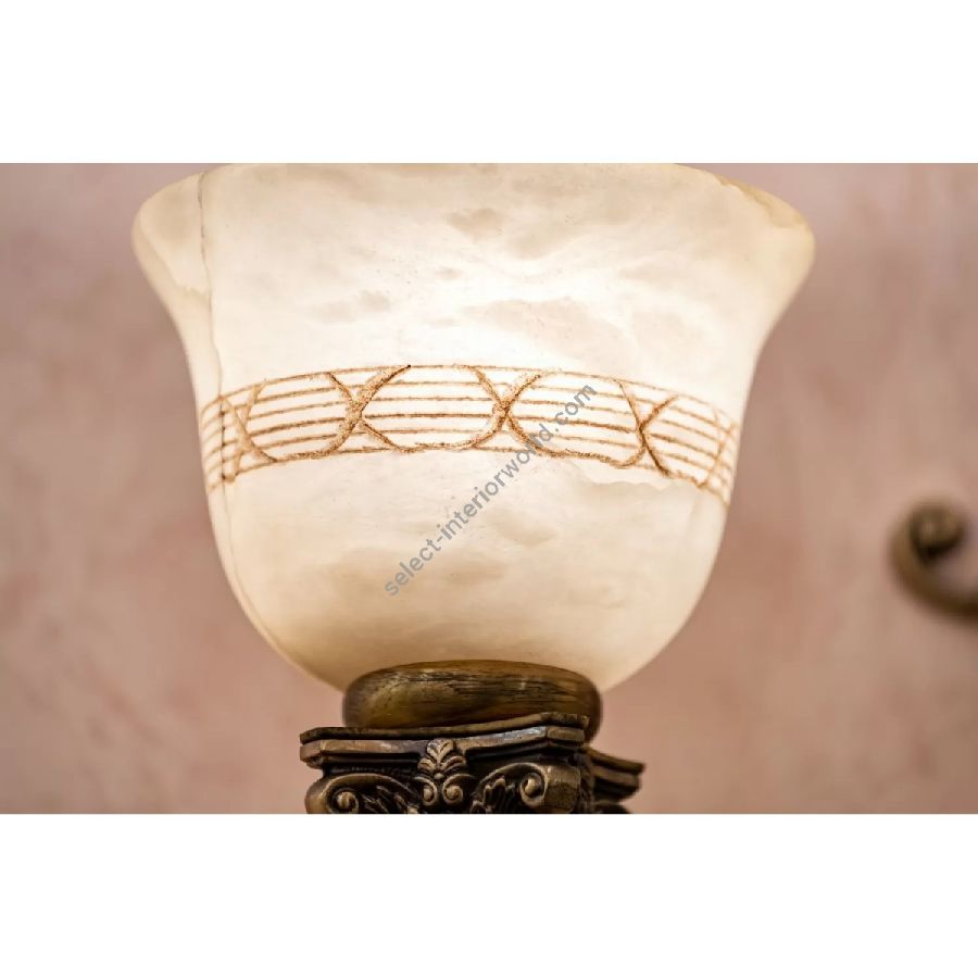 Classic style collection in satin finish brass with antique and decorated alabaster diffusers, composed of chandeliers, wall lamps and table lamps. It is possible to customize finishes and sizes.