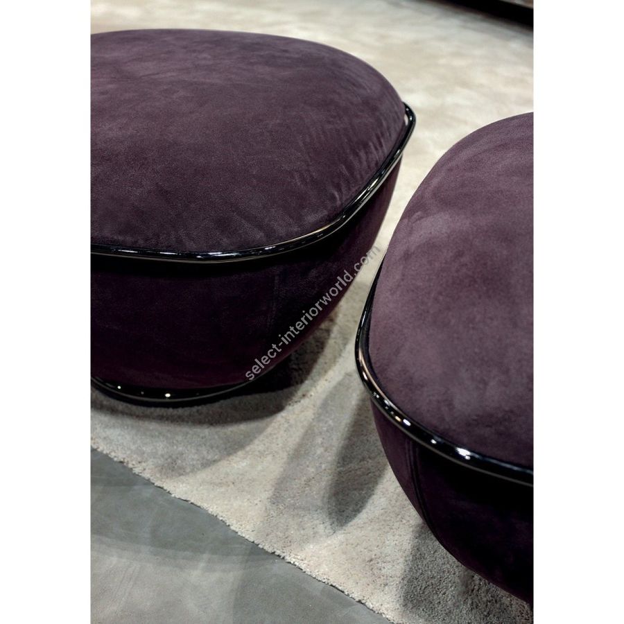 Pouf with fibreglass structure and seat cushion in wood covered with medium-density polyurethane foam. Non-removable fabric or leather upholstery. Outer metal ring beneath the seat and on the base in the finishes: bright shaded brown, bright light gold, Black Rose gold, matt Champagne gold, bright chrome, bright black chrome, matt satined bronze, bright pink gold, matt pink gold.